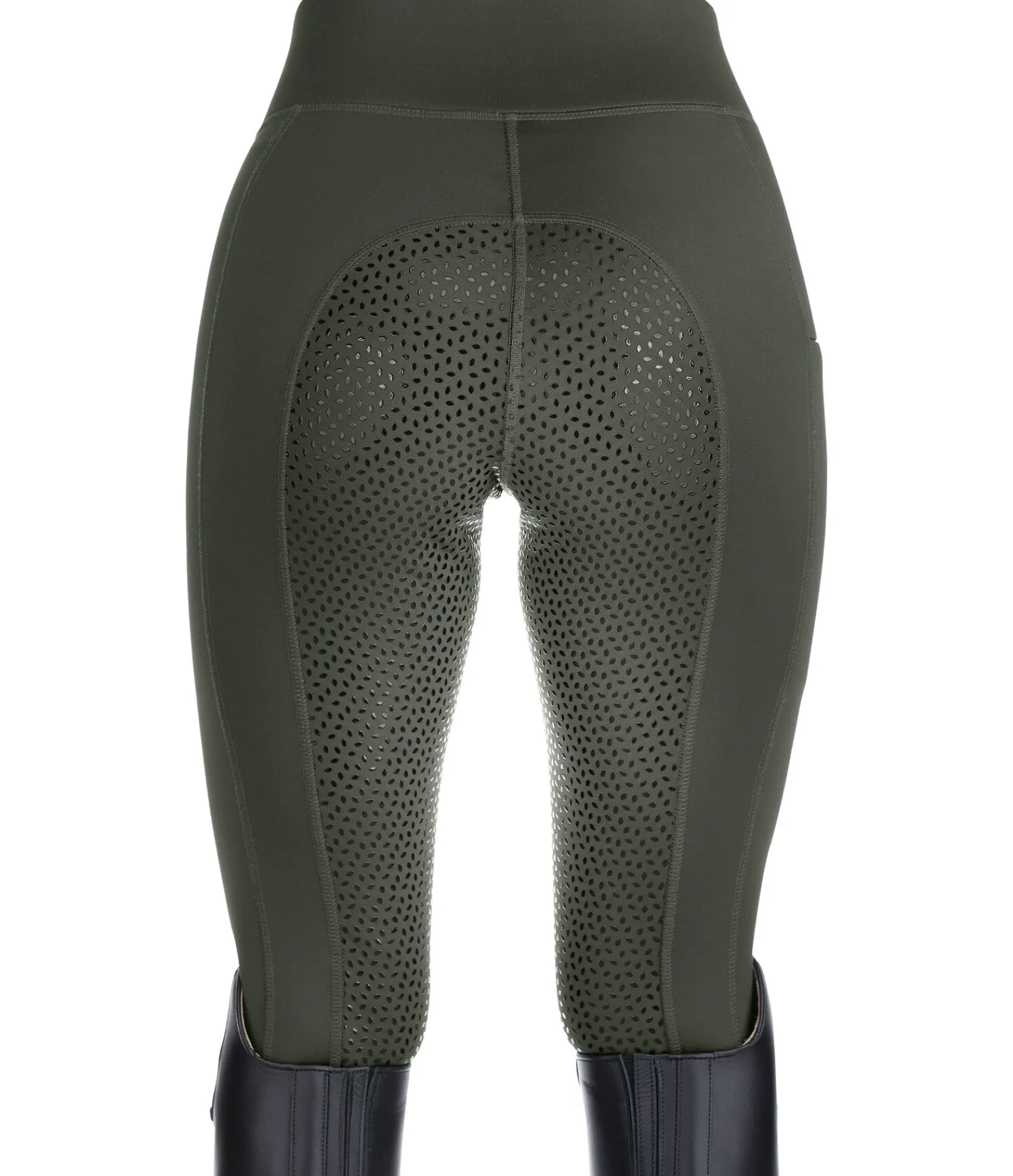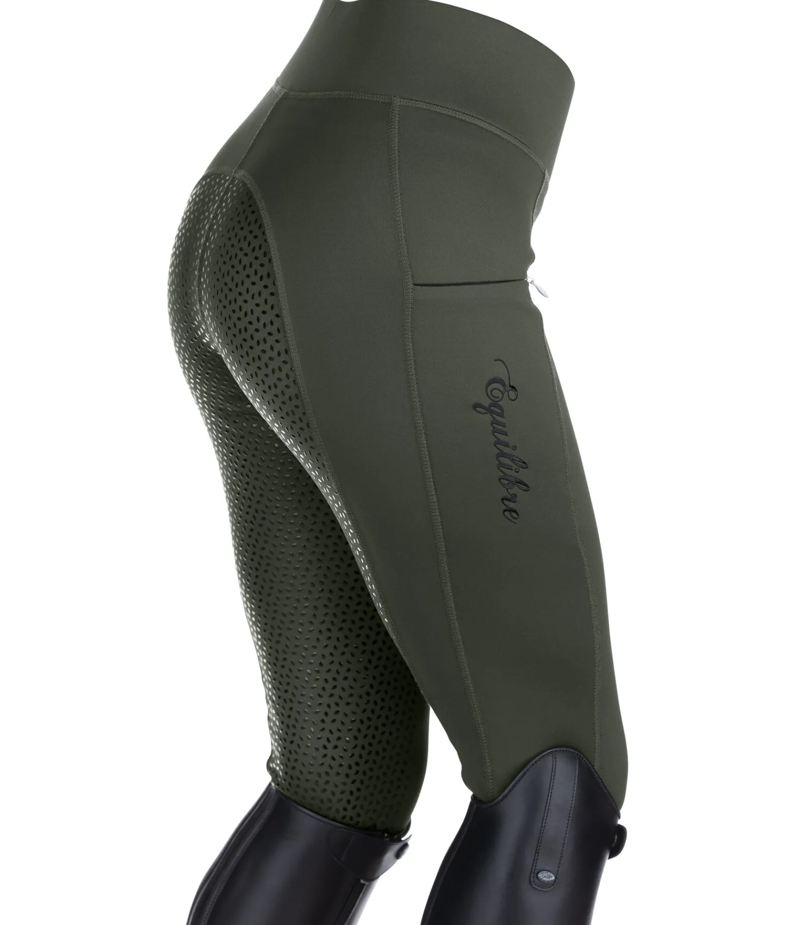 Legging d’équitation extensible avec fond intégral grip en silicone. Extérieur lisse et intérieur molletonné. Ceinture extra large élastiquée. Poche zippée pour téléphone portable sur la cuisse. Bas de jambe extensible sans patte auto-agrippante. 86 % polyester, 14 % élasthanne.