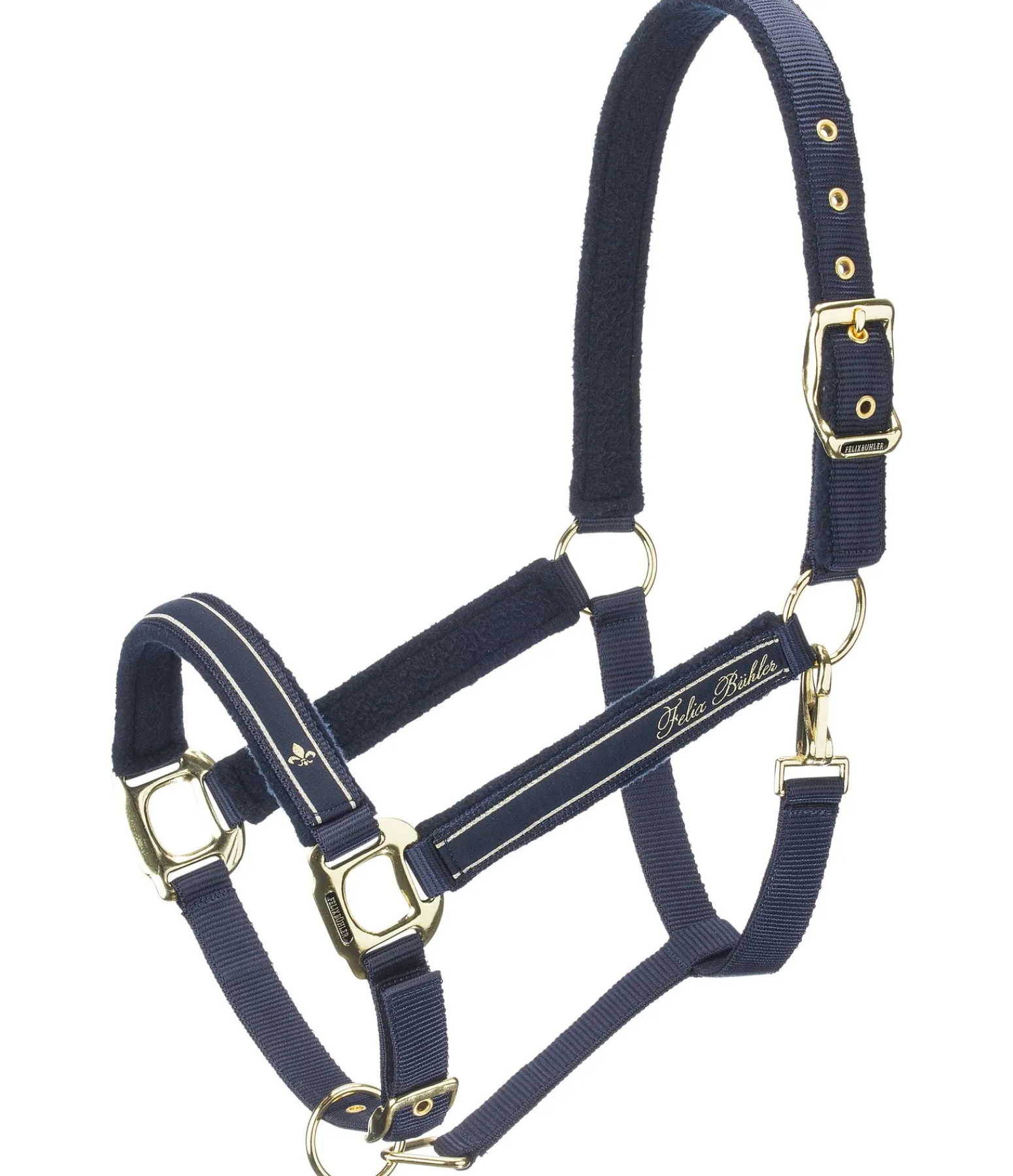 Élégant licol avec doublure en polaire douce au niveau de la têtière, des montants et de la muserolle. Fleurs de lys élégantes et scintillantes sur la muserolle et logo Felix Bühler assorti sur les montants. Têtière et muserolle facilement réglables. Bouclerie rose doré dans la couleur S, dorée dans la couleur NV et argentée dans les couleurs DQ et GL. Licol 100 % polypropylène, doublure 100 % polyester.
