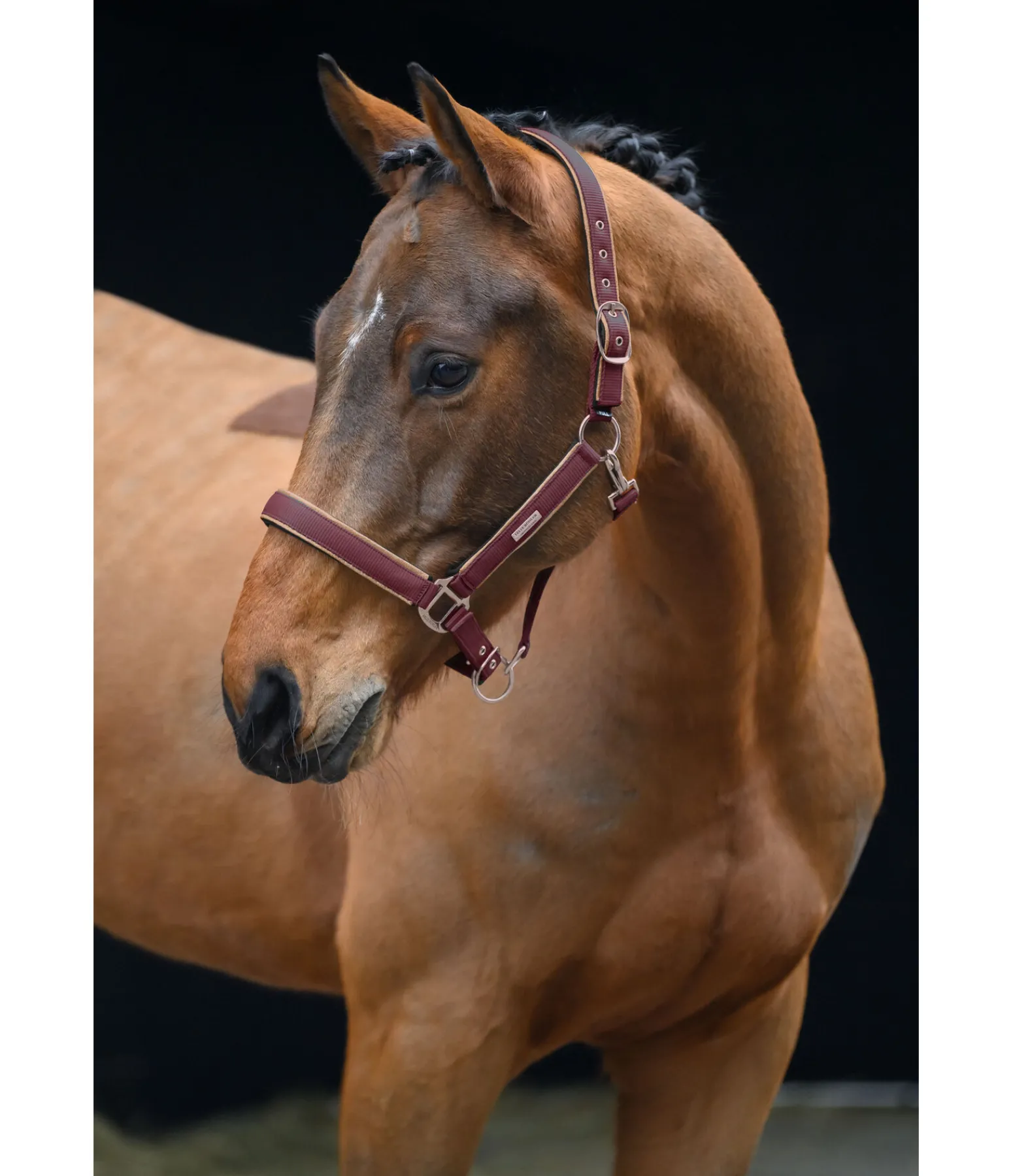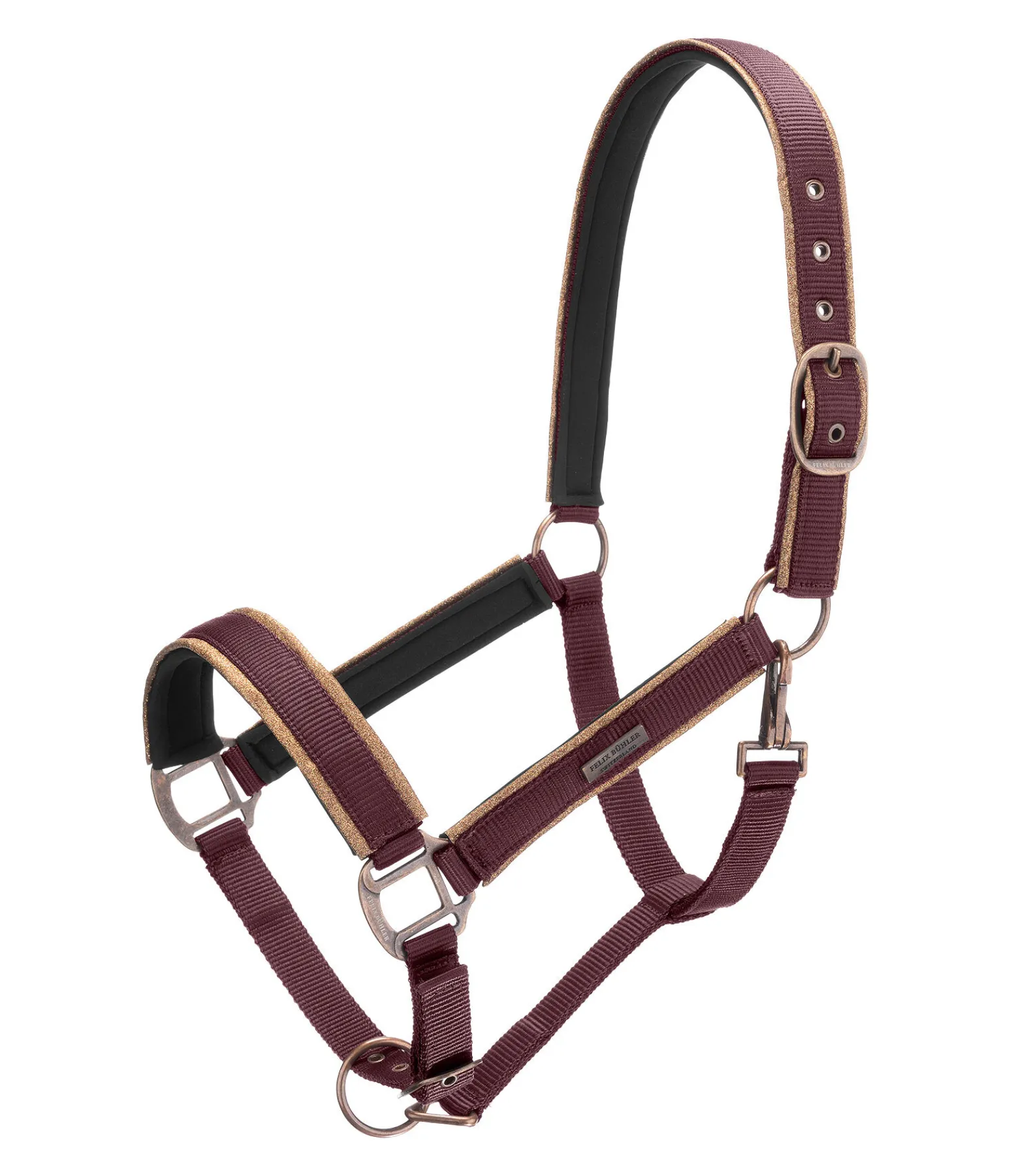 Licol chic avec passepoil scintillant et bouclerie de couleur assortie. Têtière, muserolle et montants avec doublure douce en caoutchouc chloroprène pour un confort maximal. Plaque métallique discrète avec logo gravé sur le montant gauche. Têtière et muserolle réglables. 100 % polypropylène.