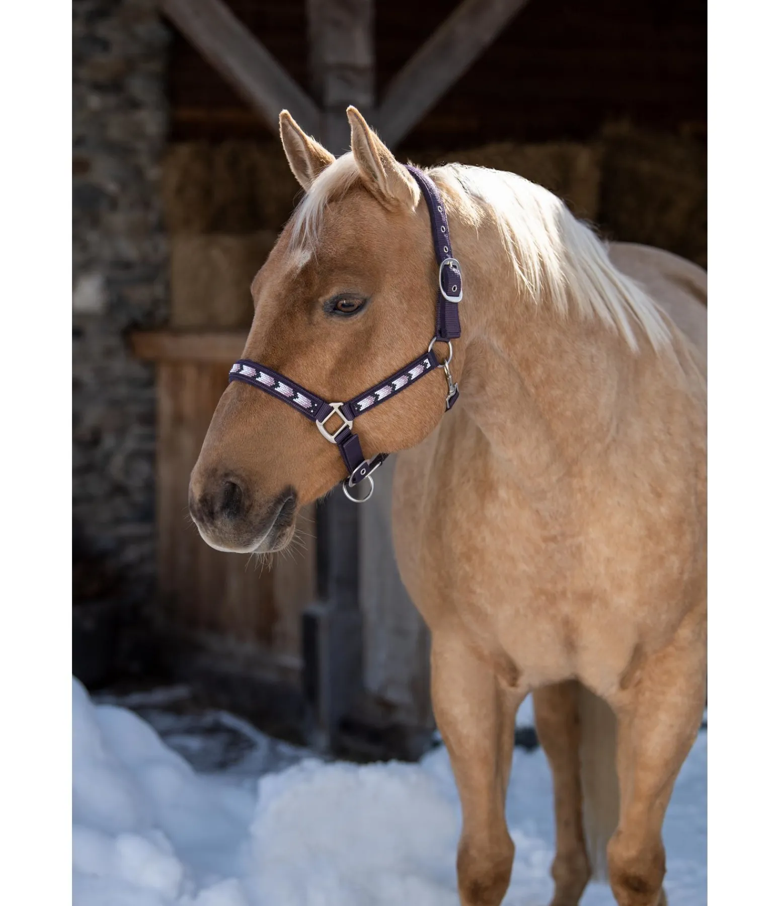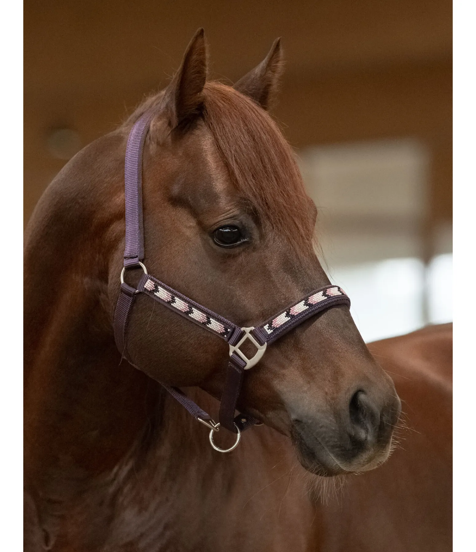 Licol en nylon avec décoration sophistiquée en perles. Rembourrage doux sur la muserolle et la têtière. Muserolle et têtière réglables.