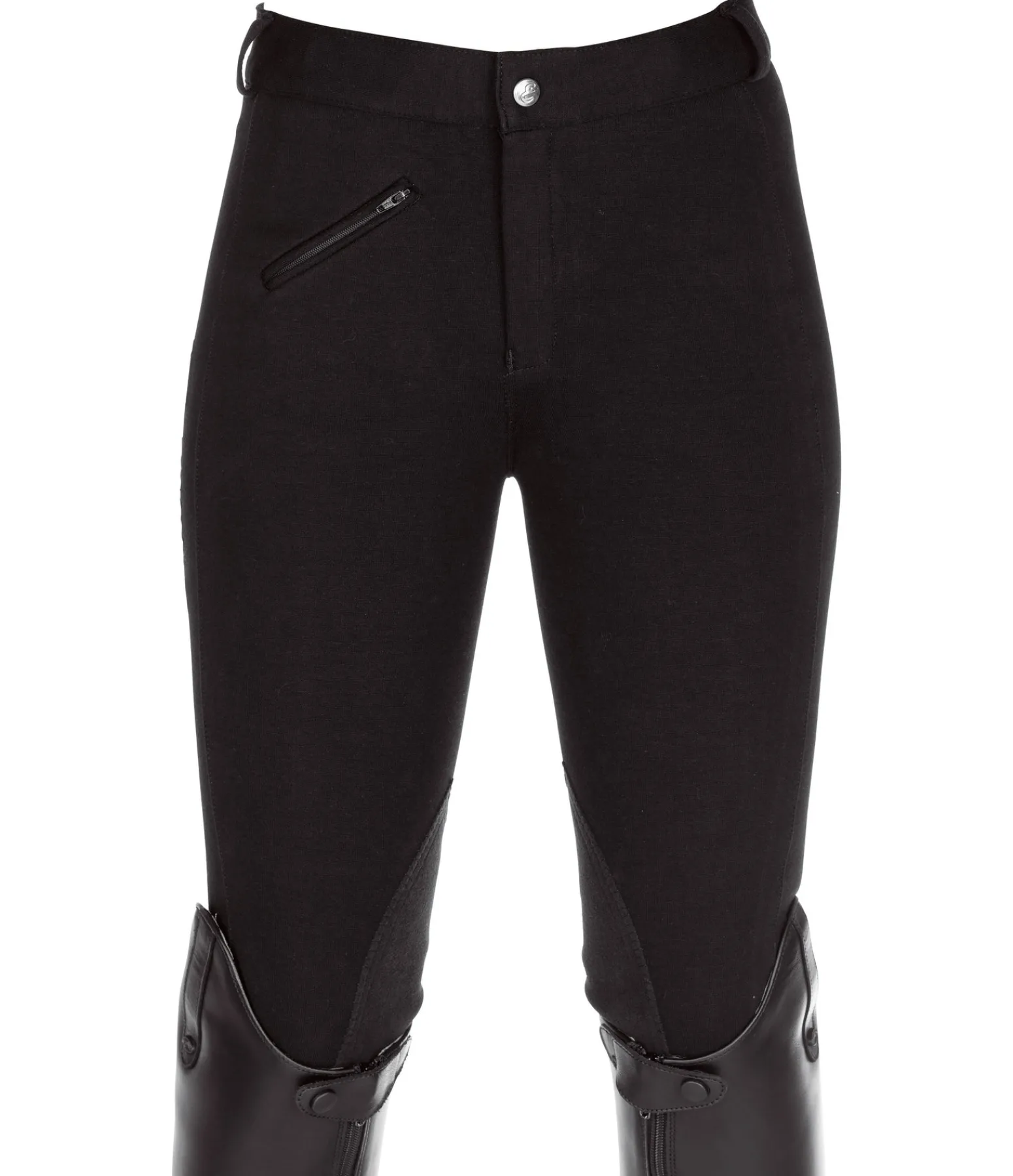 Pantalon d’équitation bicolore à basanes. Broderie de couleur contrastante sur la cuisse. 92 % coton, 8 % élasthanne.