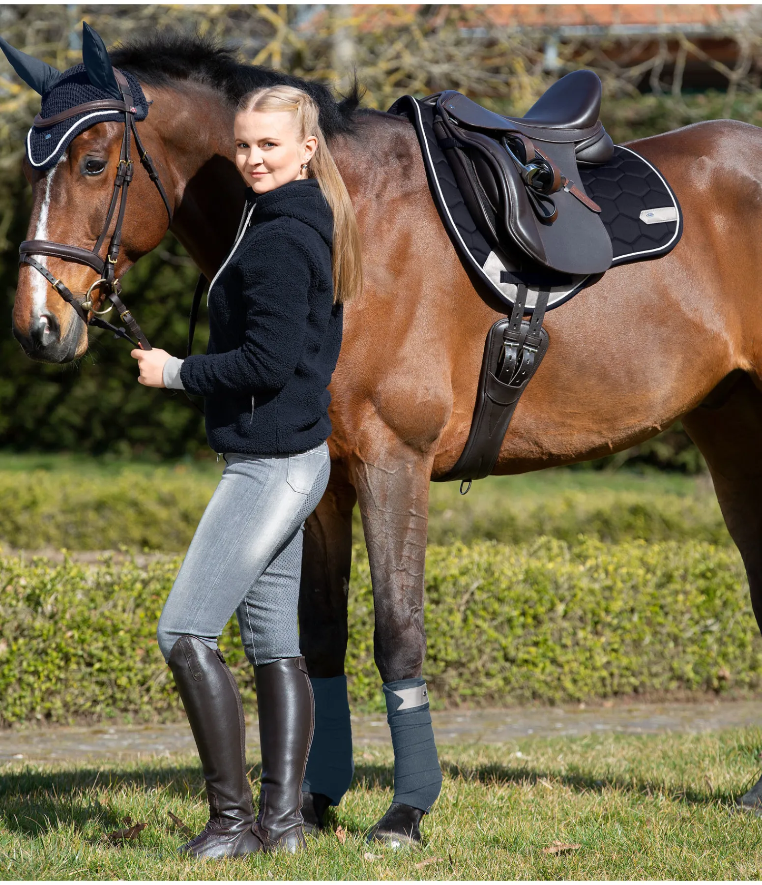 Tapis de selle dans une coupe sportswear avec protection contre les frottements de couleur contrastante à l’aspect velours au passage de sangle. Petite plaque argentée filigrane avec logo gravé de chaque côté et cordon décoratif discret satiné de couleur contrastante. Passants de sangle et de contre-sanglons avec patte auto-agrippante pratique. Dessous en Air mesh respirant et absorbant l’humidité. Dessus 100 % coton, rembourrage et dessous 100 % polyester.