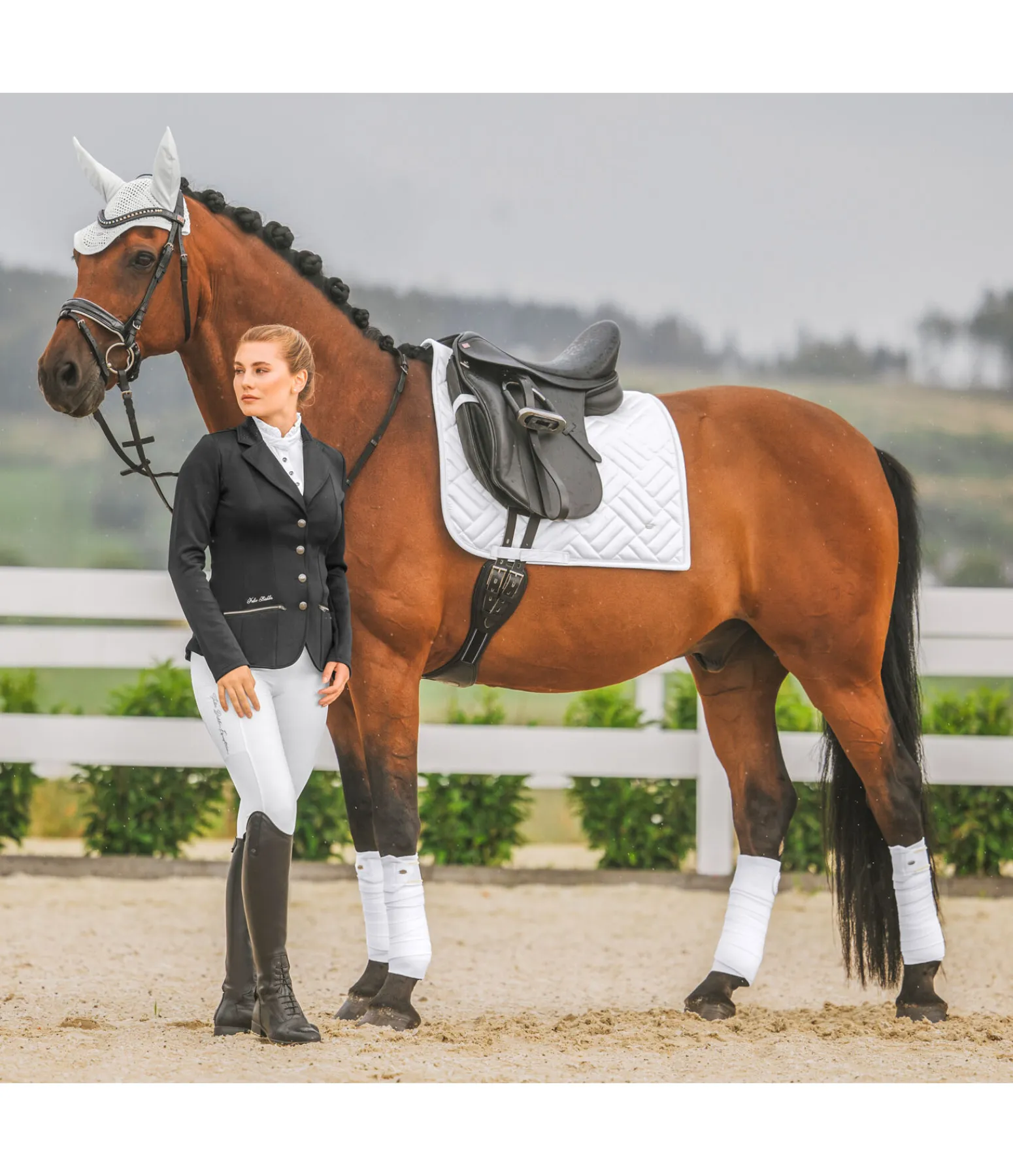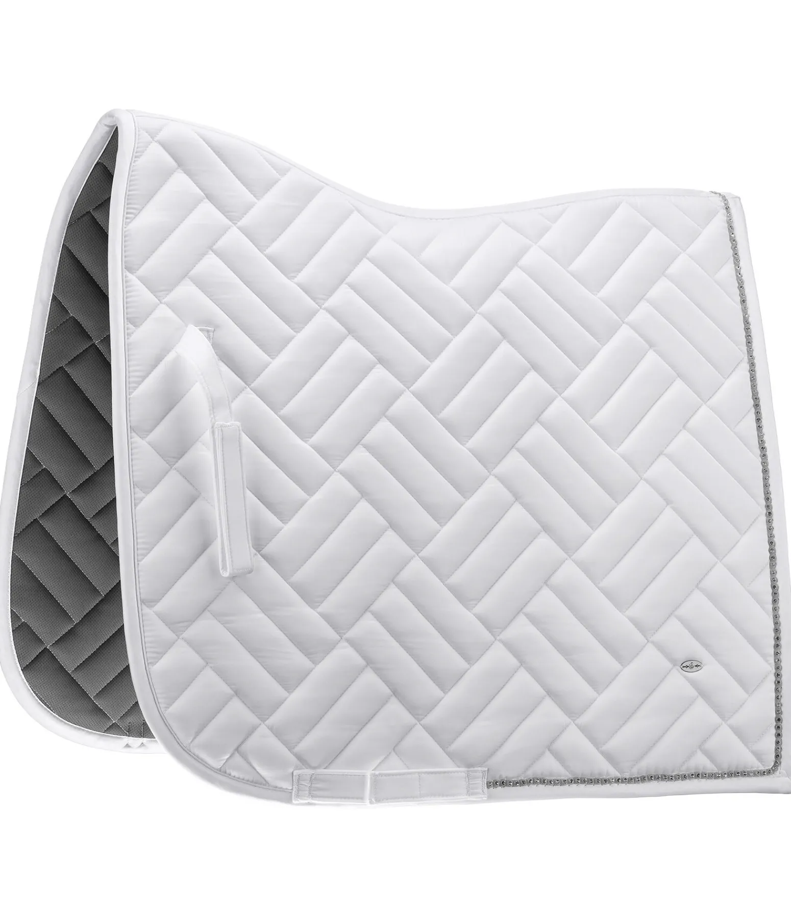 Tapis de selle de forme carrée, particulièrement élégant, avec surpiqûres apparentes. Passepoil avec strass. Petit médaillon discret avec logo gravé. Passants de sangle et de contre-sanglons avec patte auto-agrippante fonctionnelle. Dessous Air mesh respirant et absorbant l’humidité. 100 % polyester.