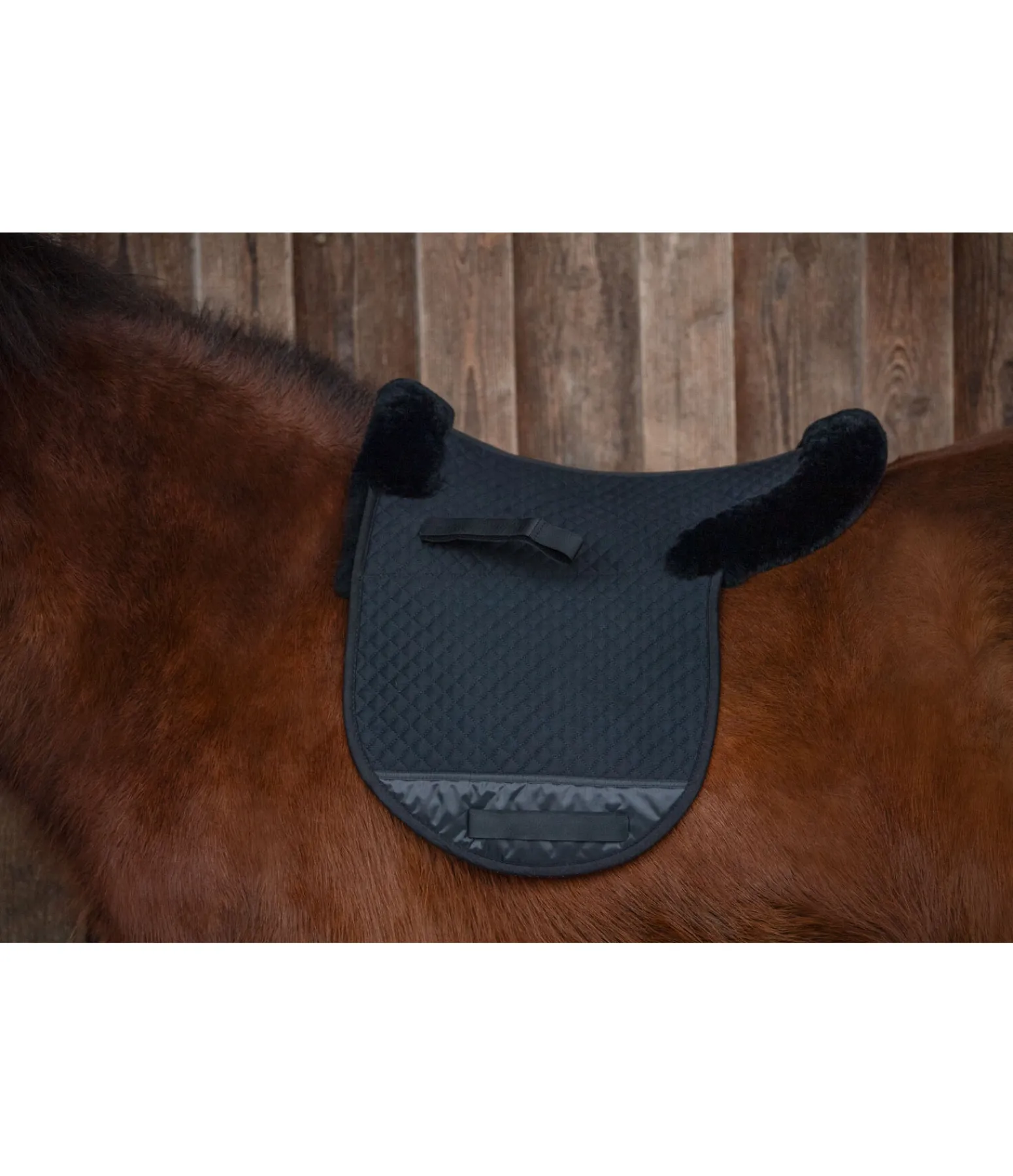 Tapis de selle de grande qualité avec dessous et bordures en véritable fourrure d’agneau. Idéal pour les chevaux sensibles. Longueur de dos 57 cm, hauteur 57 cm. Tissu matelassé souple et véritable fourrure d’agneau à tannage médical.
