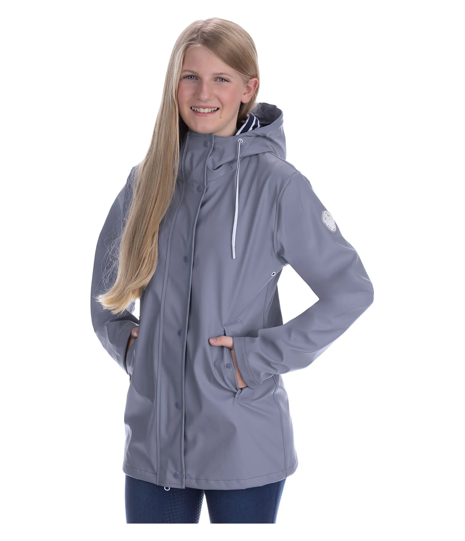 Veste de pluie imperméable et coupe-vent. Capuche réglable par cordon de serrage. Doublure intérieure rayée. Fermeture à glissière bidirectionnelle dissimulée sous une patte de boutonnage. Deux poches latérales avec bouton-pression. Badge logo STEEDS sur le bras. Trous d’aération sous chaque bras. 100 % polyuréthane, doublure intérieure 100 % polyester.