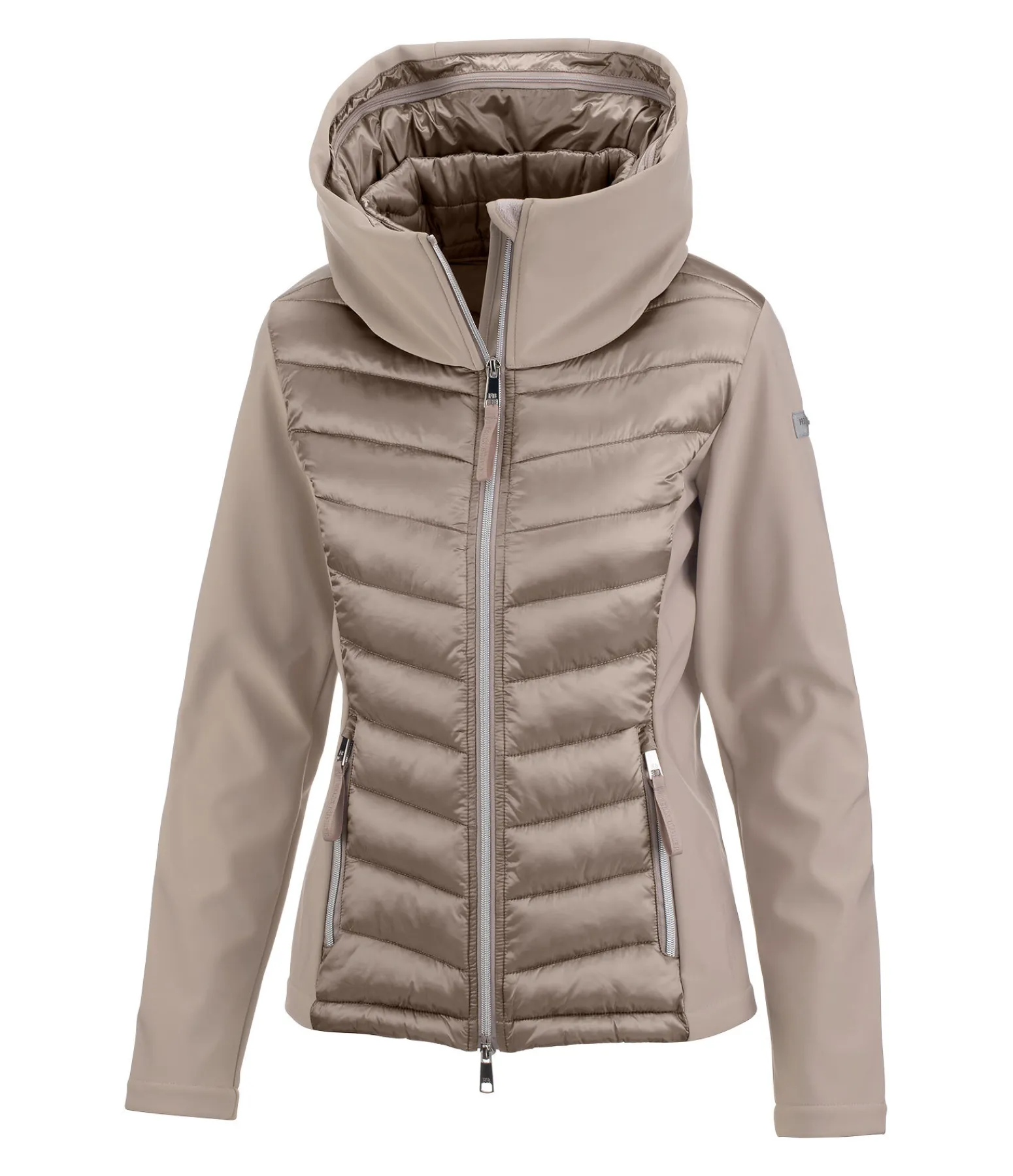 Veste d’équitation bi-matière chic. Coupe-vent. Matelassage doux et brillant avec garnissage léger en imitation duvet. Manches et côtés en softshell extensible. Col double, capuche matelassée qui se range dans le large col zippé joliment brodé. Fermeture à glissière double sens brillante avec sous-patte et protège-menton. Deux poches latérales zippées. Taille réglable. 100 % nylon ; softshell 92 % polyester, 8 % élasthanne.