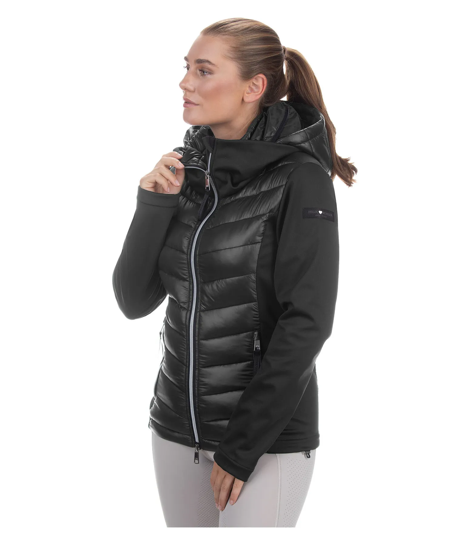 Veste d’équitation bi-matière chic. Coupe-vent. Matelassage doux et brillant avec garnissage léger en imitation duvet. Manches et côtés en softshell extensible. Col double, capuche matelassée qui se range dans le large col zippé joliment brodé. Fermeture à glissière double sens brillante avec sous-patte et protège-menton. Deux poches latérales zippées. Taille réglable. 100 % nylon ; softshell 92 % polyester, 8 % élasthanne.