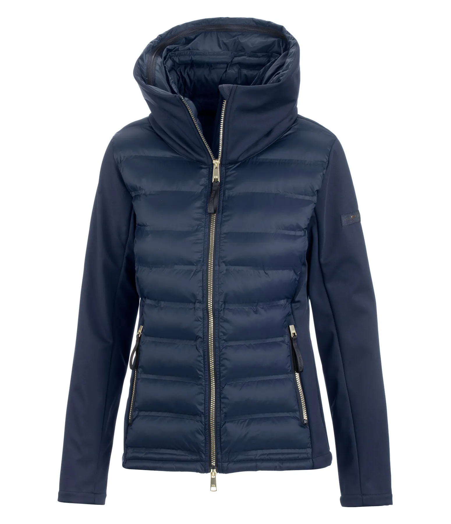Superbe combinaison de softshell extensible et de nylon avec un garnissage très doux en imitation duvet devant et derrière. Coupe-vent. Double col et capuche rembourrée repliable dans le large col extérieur par fermeture à glissière. Coutures thermosoudées, fermeture à glissière double sens avec sous-patte et protège-menton, 2 poches zippées devant. Logo élaboré sur la manche et le col. Avant, dos, col intérieur et capuche 100 % nylon, matière softshell 92 % polyester, 8 % élasthanne.