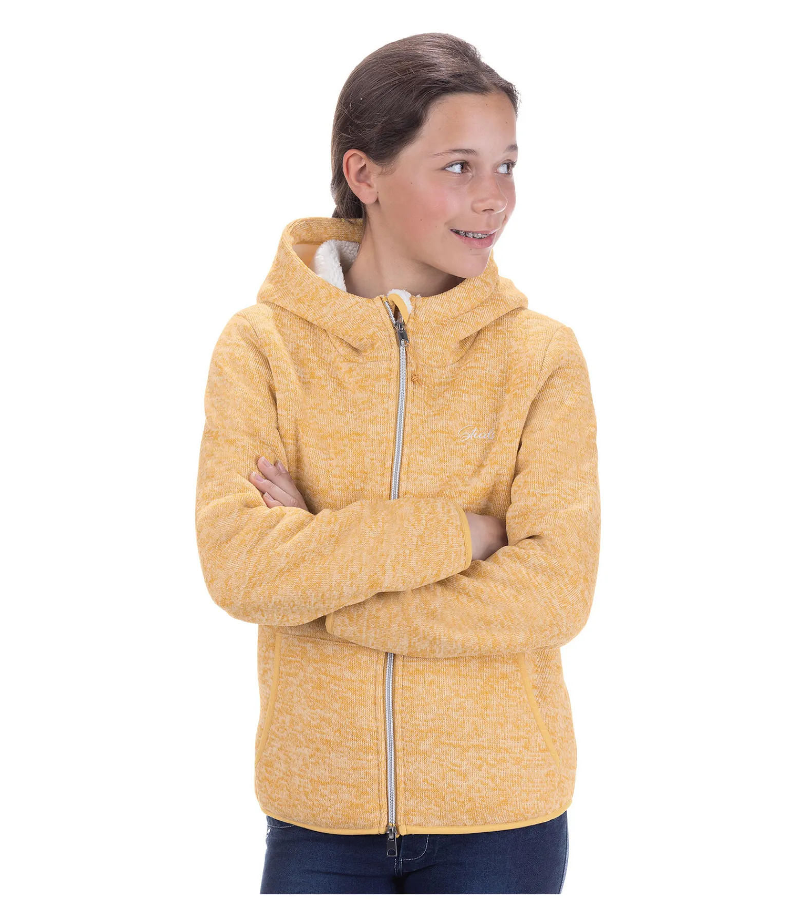 Jolie veste en tricot polaire. Aspect chiné. Logo discret brodé sur la poitrine. Intérieur et capuche doublés en polaire Teddy douce de couleur contrastante. Fermeture à glissière bidirectionnelle avec protège-menton. Deux poches latérales. 100 % polyester.