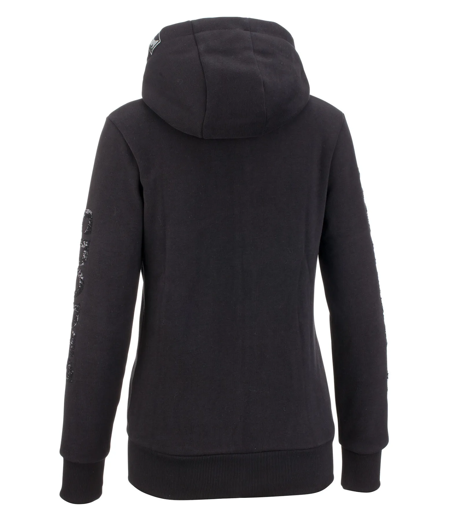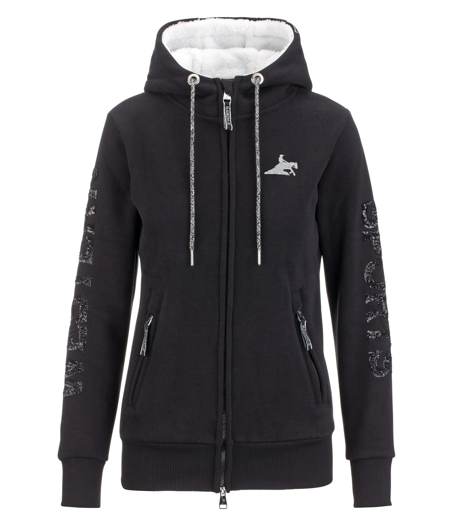 Veste sweat à capuche. Sportswear. Capuche avec doublure douce et cordon de serrage scintillant. Fermeture à glissière double sens. 2 poches latérales zippées. Inscription pailletée sur chaque manche. 55 % coton, 45 % polyester.