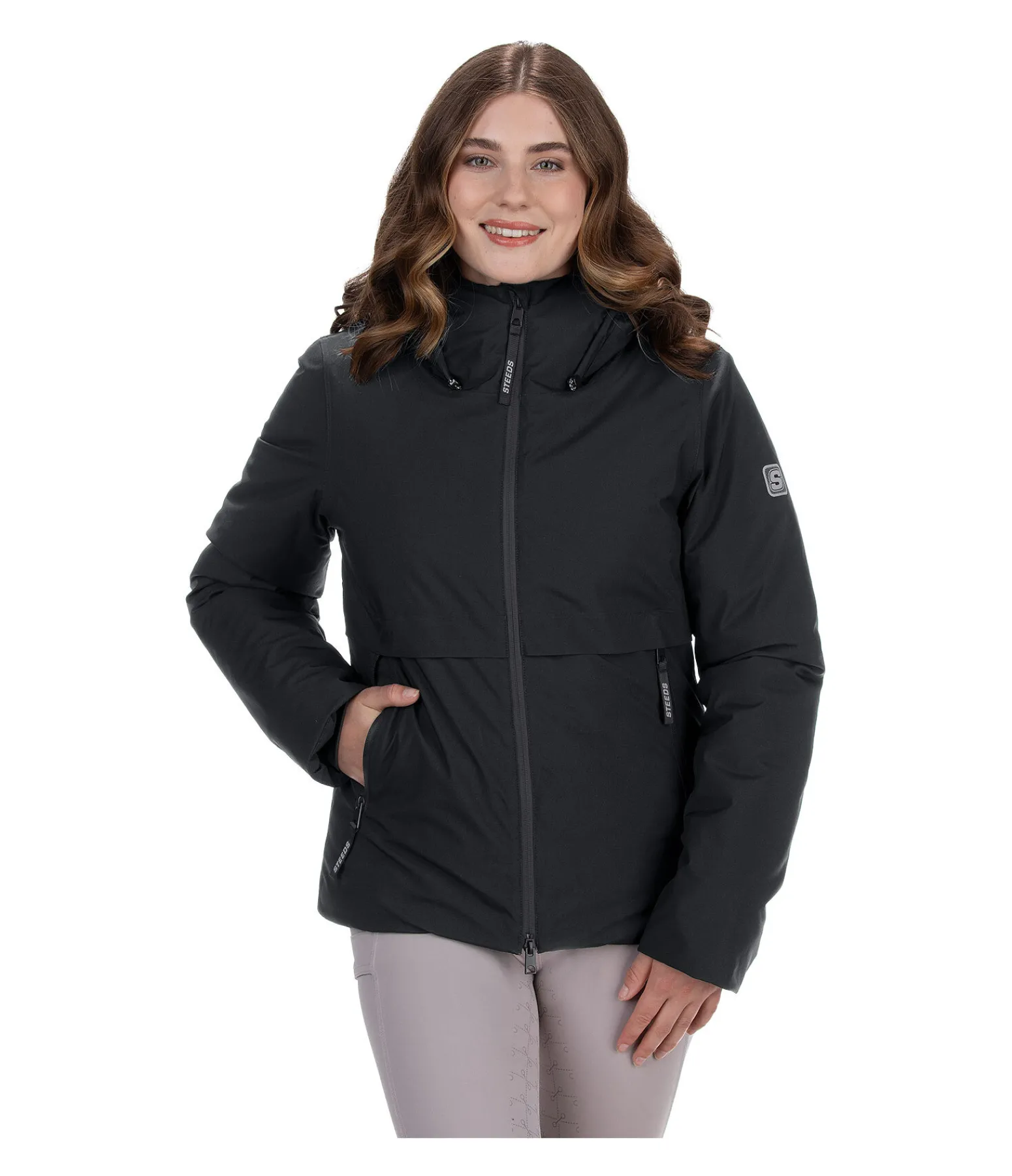 Veste d’équitation à capuche très technique dans une coupe sportive avec doublure chaude en polaire douce. Très imperméable (10.000 mm), coupe-vent et respirante (5.000 MVP). Fermeture à glissière double sens étanche, 2 poches zippées étanches devant, logo STEEDS réfléchissant sur le bras et dans le dos. Capuche réglable doublée en polaire pouvant être fixée dans le dos. Matière : 100 % polyester.