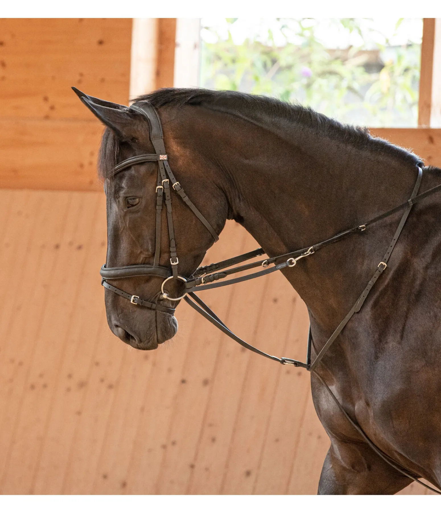 Combinaison de martingale en cuir avec fourche allongée et mousquetons aux extrémités avec rênes dotés de 3 anneaux semi-circulaires fixes permettant différents réglages. Empêche le cheval de lever trop la tête, sans toutefois limiter sa liberté de mouvement, car le cavalier peut lâcher les rênes à sa guise et n’est pas limité par des rênes fixes. En cuir véritable.