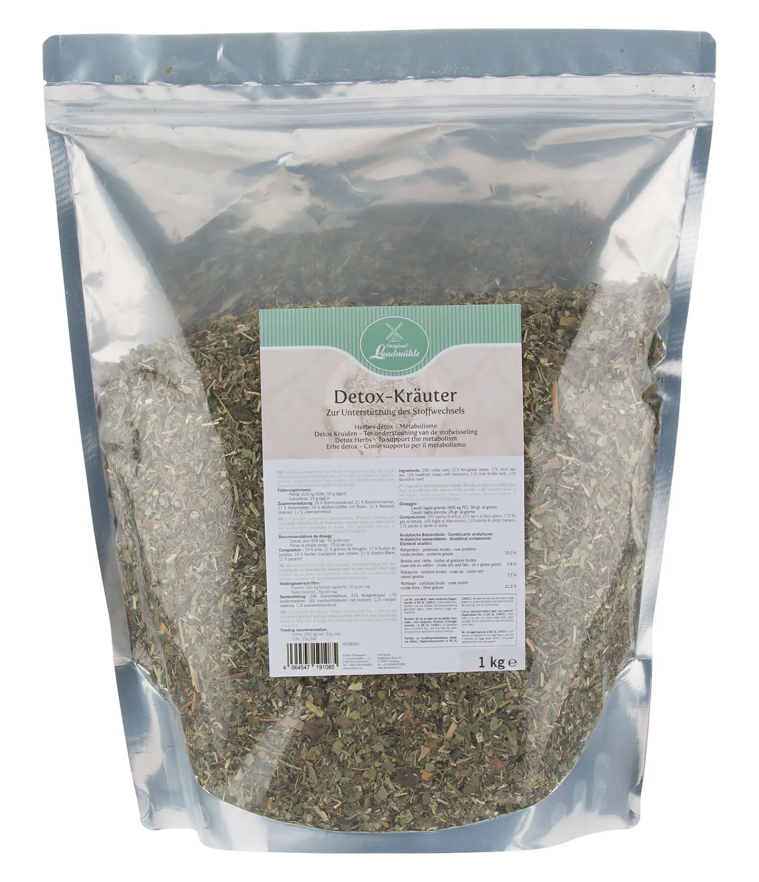 Aliment complémentaire pour chevaux. Mélange d’herbes à base d’ortie, de chardon-Marie et de pissenlit pour soutenir le métabolisme. Peut avoir une action détoxifiante et drainante et un effet positif sur les fonctions hépatiques et rénales. L’aubépine peut également stimuler la circulation sanguine, activant ainsi le système cardiovasculaire.