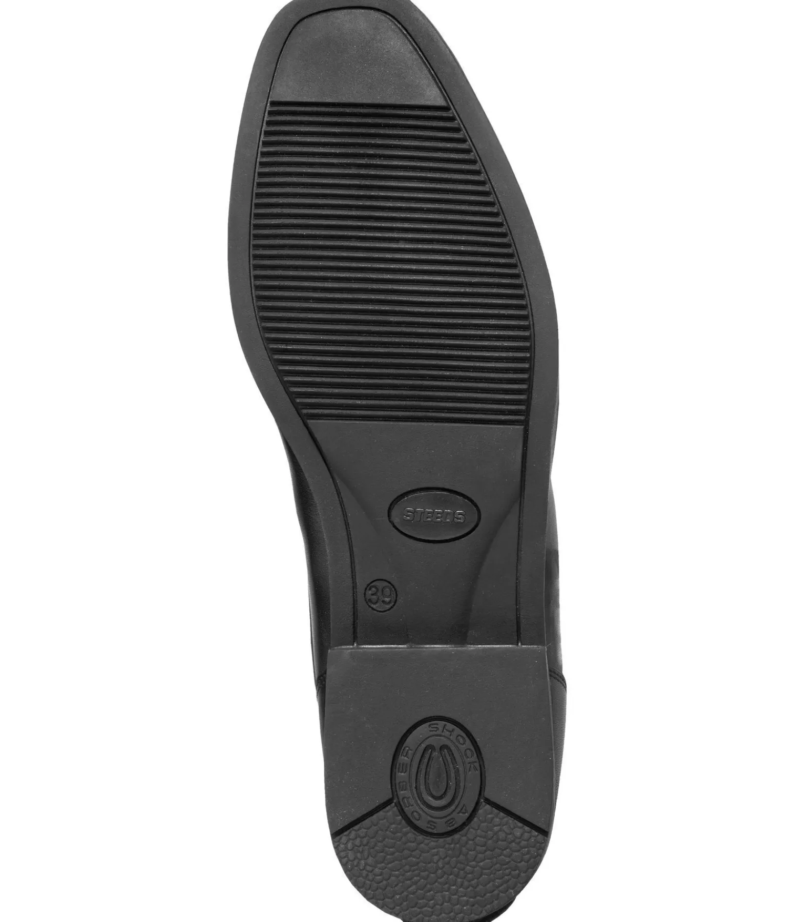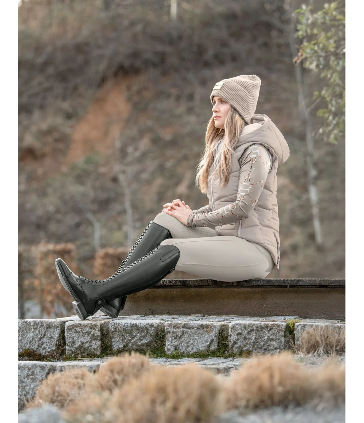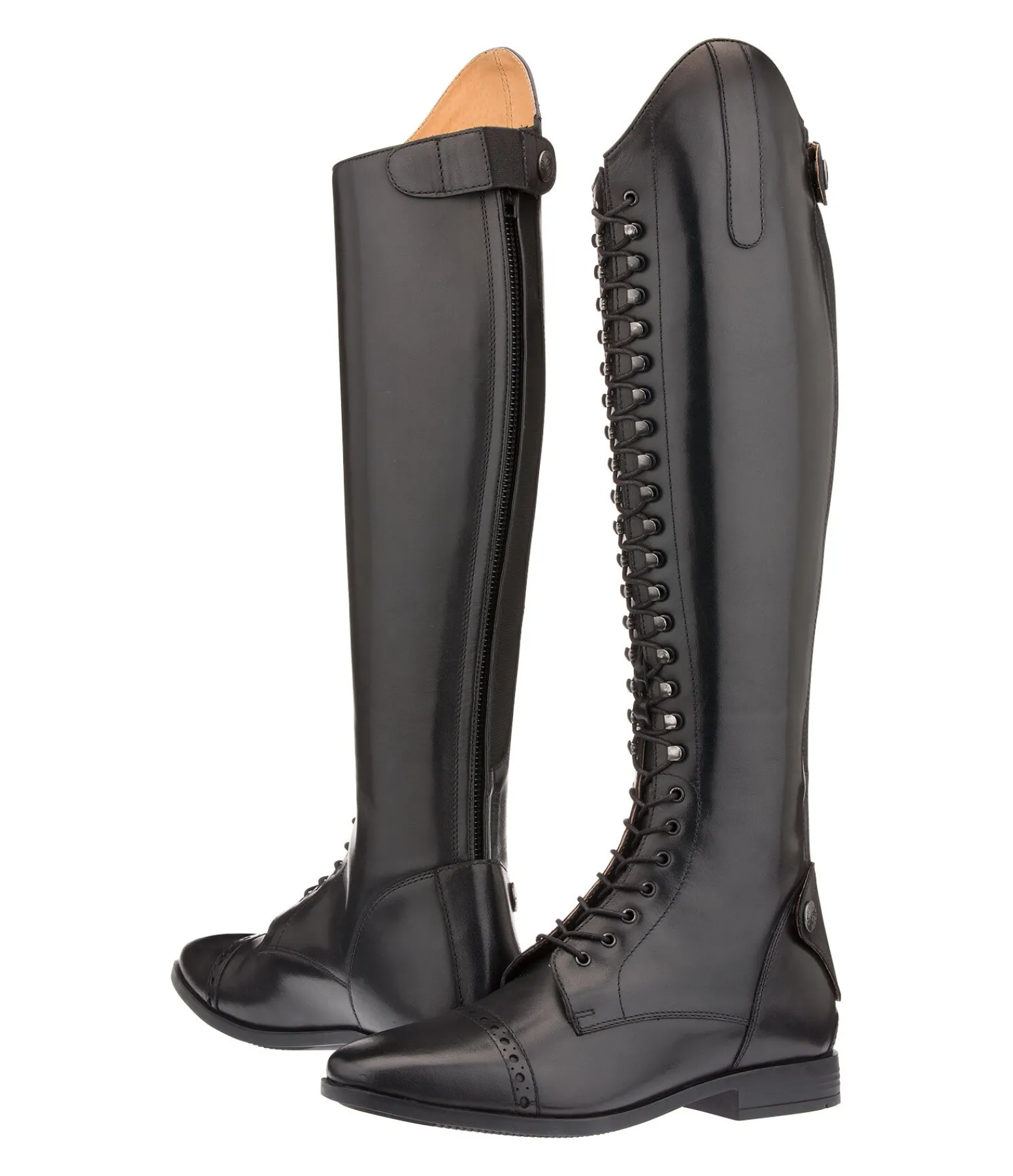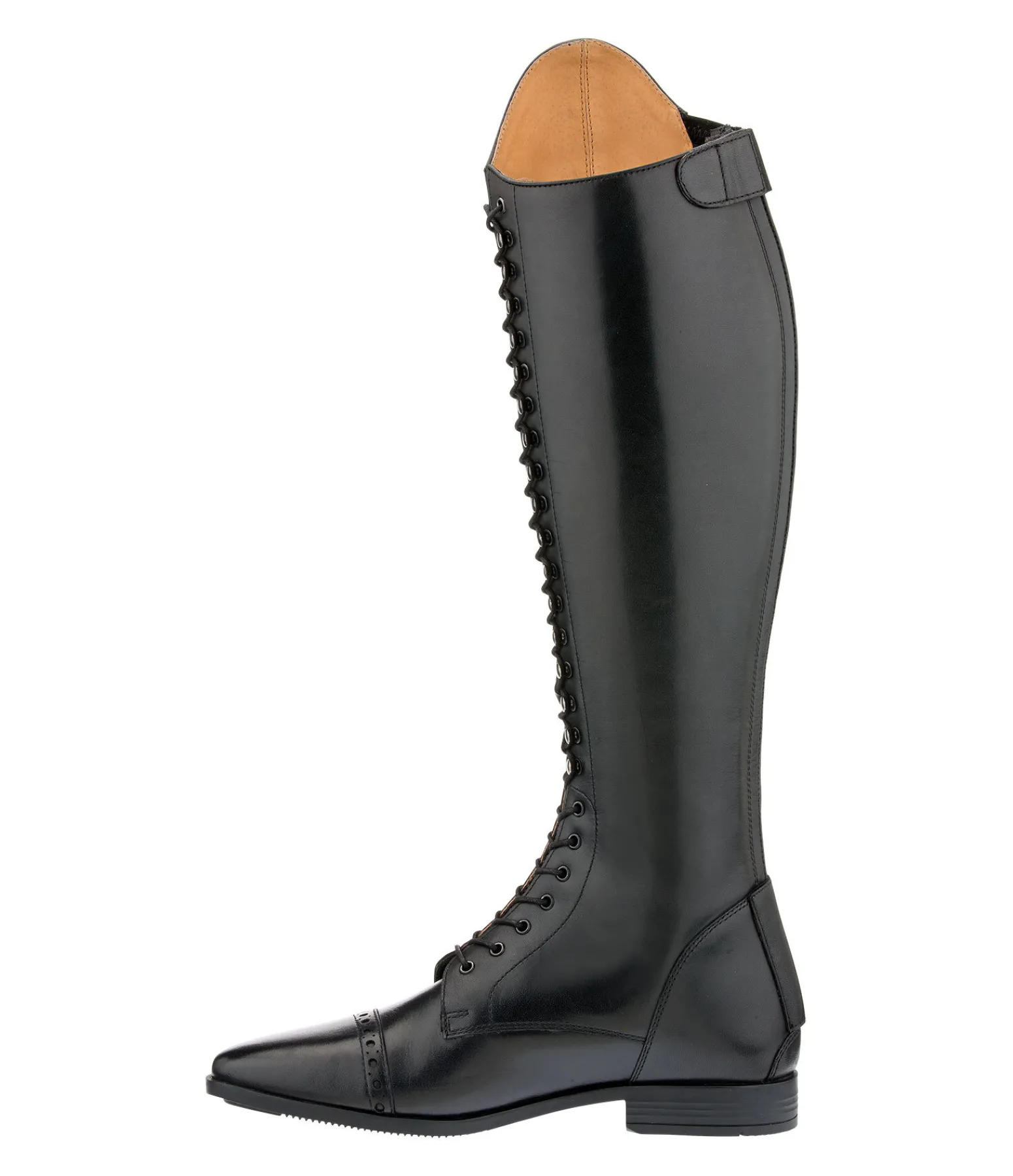 Bottes d’équitation élégantes en cuir de vachette brésilien pleine fleur. Laçage à l’avant pour une parfaite adaptation à la forme du mollet. Languette intérieure en cuir intégrée derrière le laçage. Insert élastiqué à l’extérieur de la tige pour plus de confort et un ajustement optimal. Doublure intérieure en cuir de porc souple. Fermeture à glissière à l’arrière (YKK n° 10) haut de gamme et solide. Rabat au talon pour protéger le cuir et la fermeture à glissière contre le frottement des éperons. Semelle extérieure crantée de forme carrée à bout fin pour une adhérence optimale dans l’étrier. Semelle intérieure amovible avec rembourrage en mousse EVA au talon pour absorber les chocs et garantir un confort optimal.