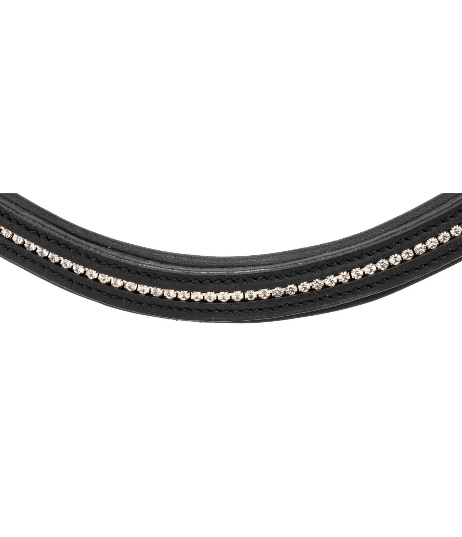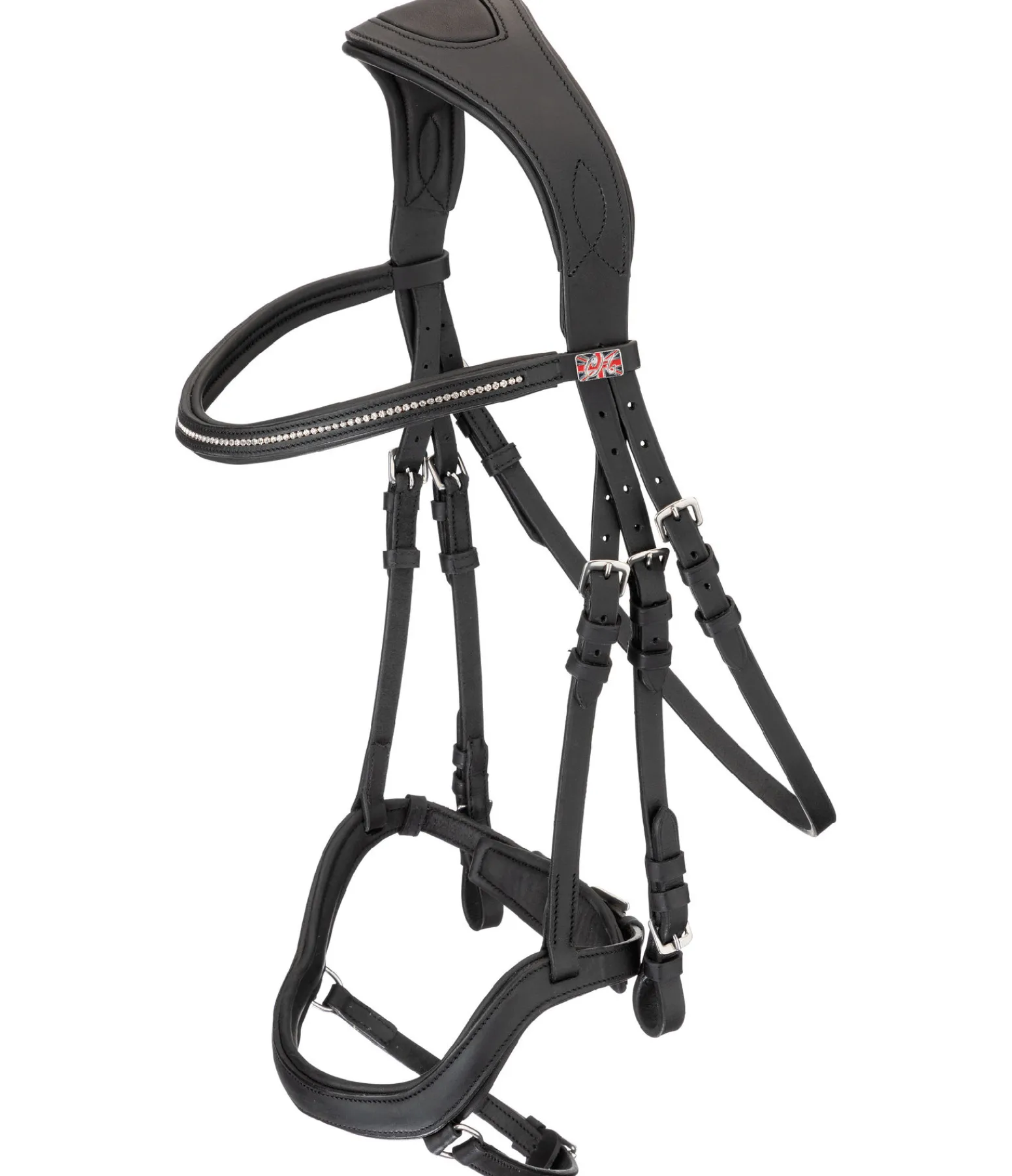 Bridon sportif et élégant en cuir gras souple, avec frontal scintillant orné d’une rangée de petites pierres blanches. Muserolle combinant les effets d’une muserolle française et d’une muserolle allemande. Les anneaux de fixation latéraux du noseband permettent d’éviter les pressions sur l’os du nez et offrent plus de confort et davantage de liberté aux naseaux. Têtière anatomique extra large, muserolle, pad de menton et frontal avec doublure extra douce en cuir véritable. Cuir gras. Bouclerie argentée. Sans rênes, sans mors.