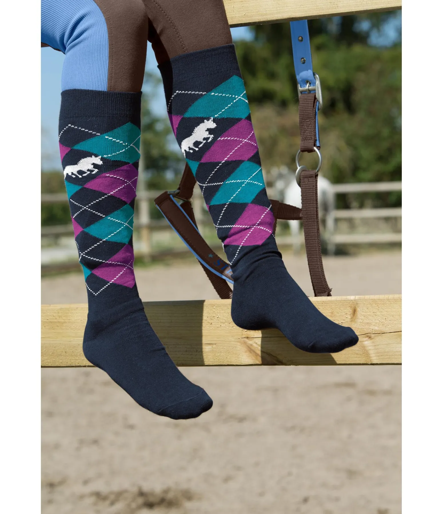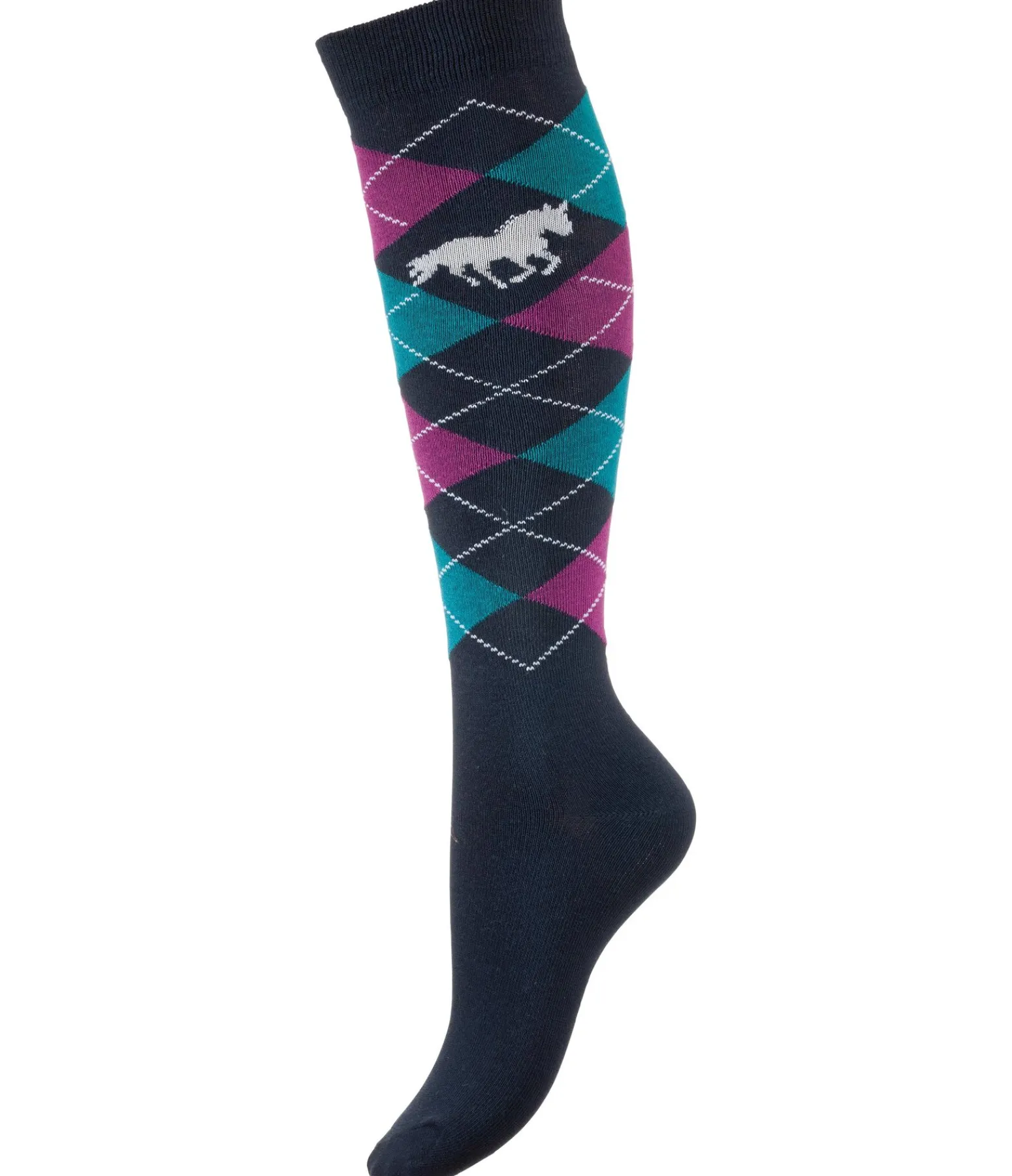 Chaussettes hautes pour enfant en design losanges classique avec motif cheval. Matières : 80 % coton, 20 % élasthanne.