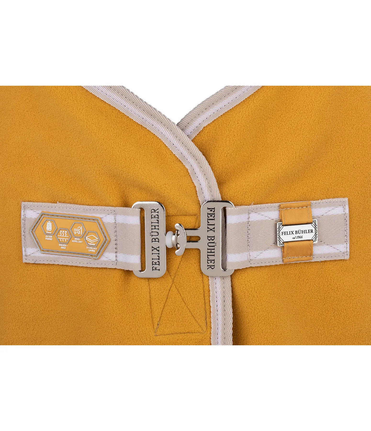 Chemise séchante. Look sportif avec plaque gravée Felix Bühler élégante sur la fermeture de poitrail et au niveau de l’arrière-main. Superbes bordures rayées. Fermeture de poitrail avec crochet en T. Sangle ventrale amovible et réglable. Pad de garrot en polaire douce et doublure lisse satinée au niveau des épaules et du poitrail, pour éviter la casse de crins et les irritations dues aux frottements. Solide courroie de queue réglable incluse. 100 % polyester.