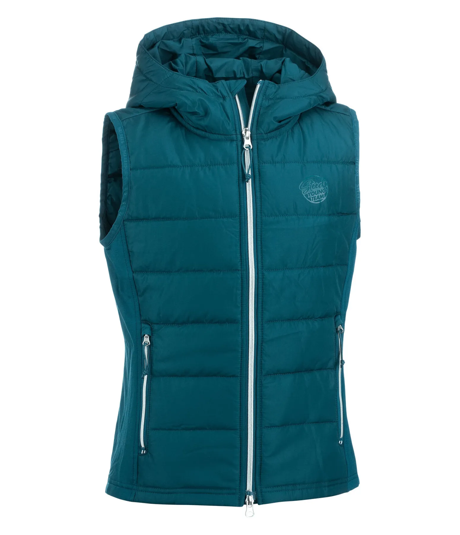 Gilet d’équitation à capuche. Inserts latéraux en stretch Performance doux et matelassés à l’avant et au dos. Capuche matelassée. Bouton-pression pour fixer la capuche dans le dos. Fermeture à glissière bidirectionnelle avec protège-menton. Deux poches latérales zippées. Badge STEEDS sur la poitrine. 100 % polyester, inserts stretch 96 % polyester, 4 % élasthanne.