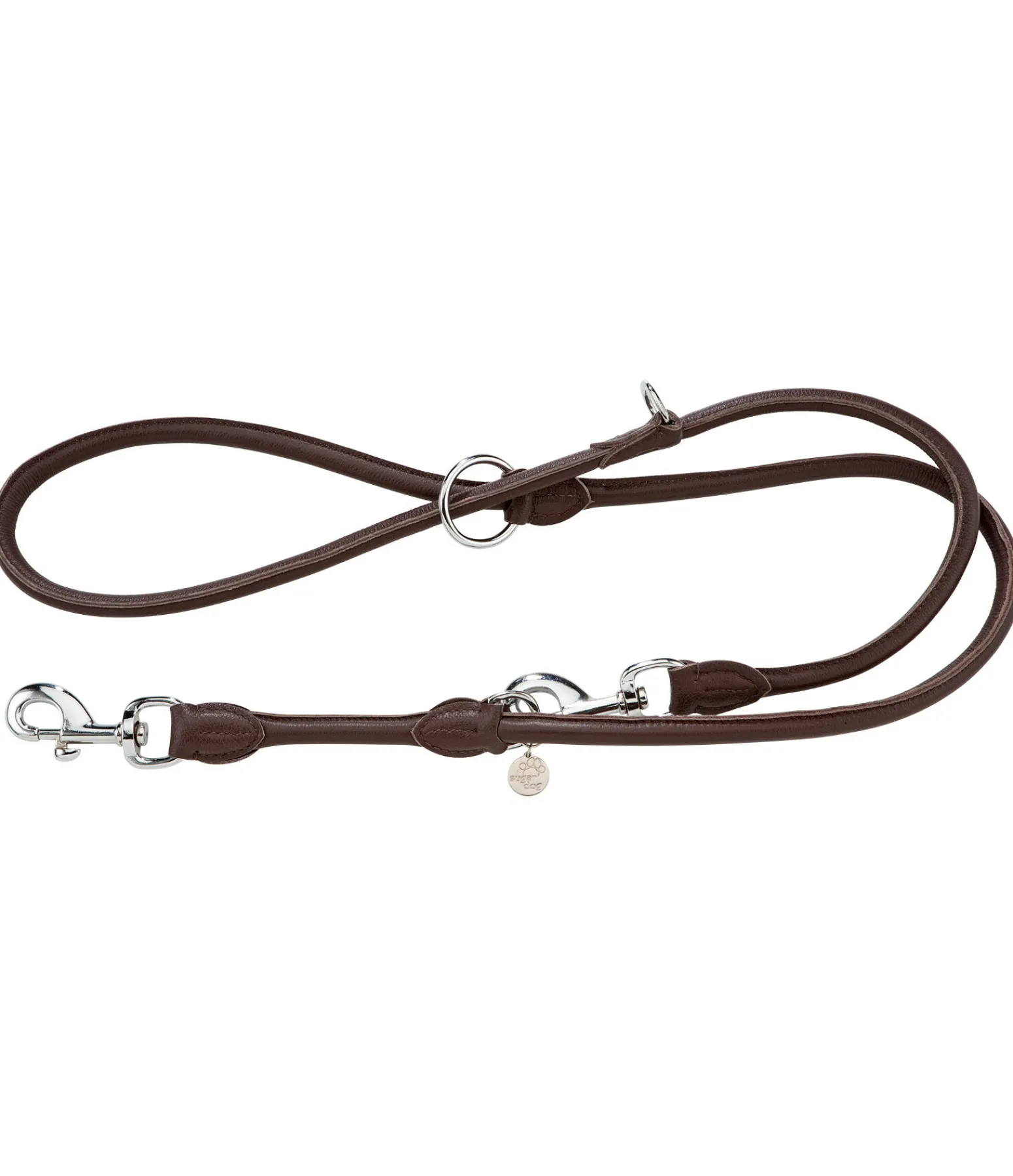 Laisse ronde en cuir véritable. Toucher doux. Longueur réglable sur 3 positions grâce à 3 anneaux et 1 mousqueton. Bouclerie rose doré dans la couleur BS et argentée dans la couleur BR et TB. Petit médaillon avec logo.