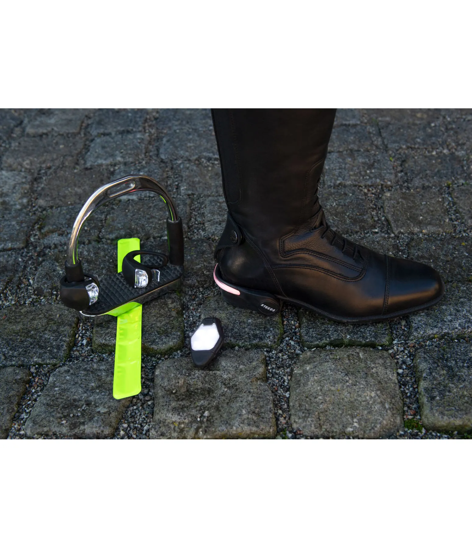 À placer simplement sur le talon de la chaussure. Lumière rouge fixe ou clignotante. Livrée avec 2 piles LR44 échangeables. Vendue à l’unité.