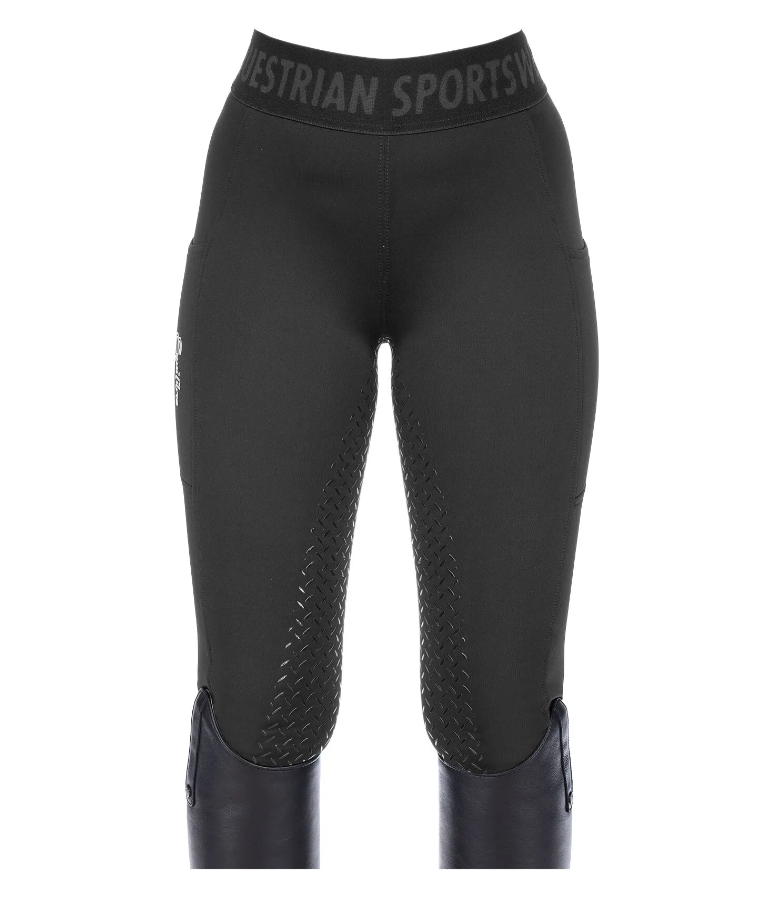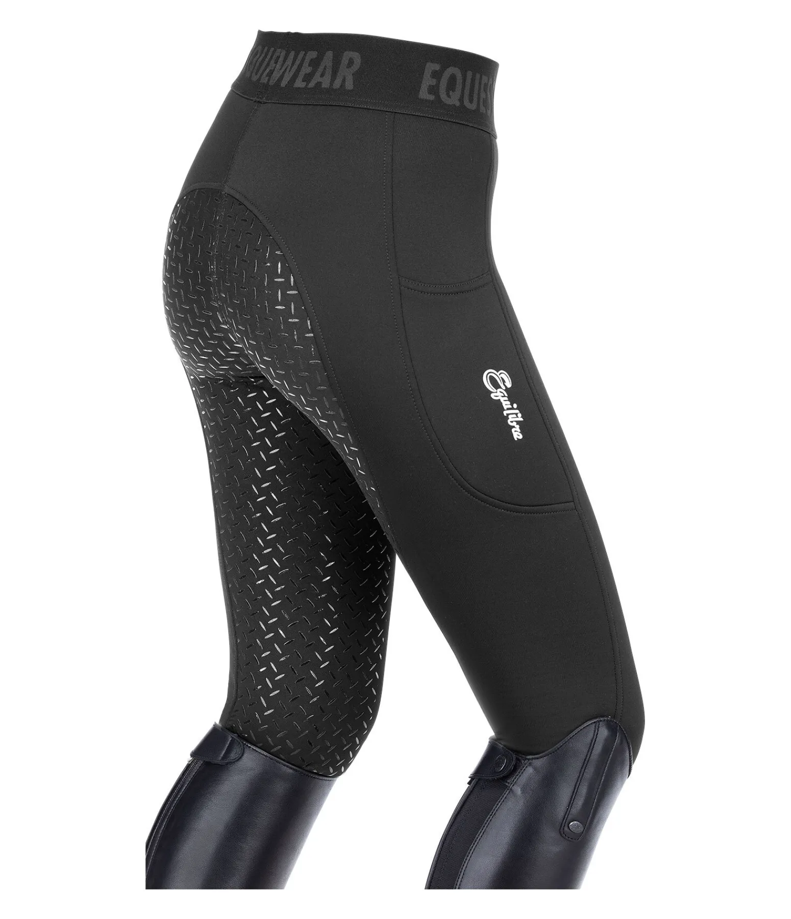 Legging d’équitation chaud avec ceinture élastiquée extra large. Matière stretch respirante et extensible dans 4 directions. Intérieur molletonné. Fond intégral grip en silicone. 2 poches avant. Imprimé Equilibre sur la poche droite. 60 % polyester, 30 % polyamide, 10 % élasthanne.