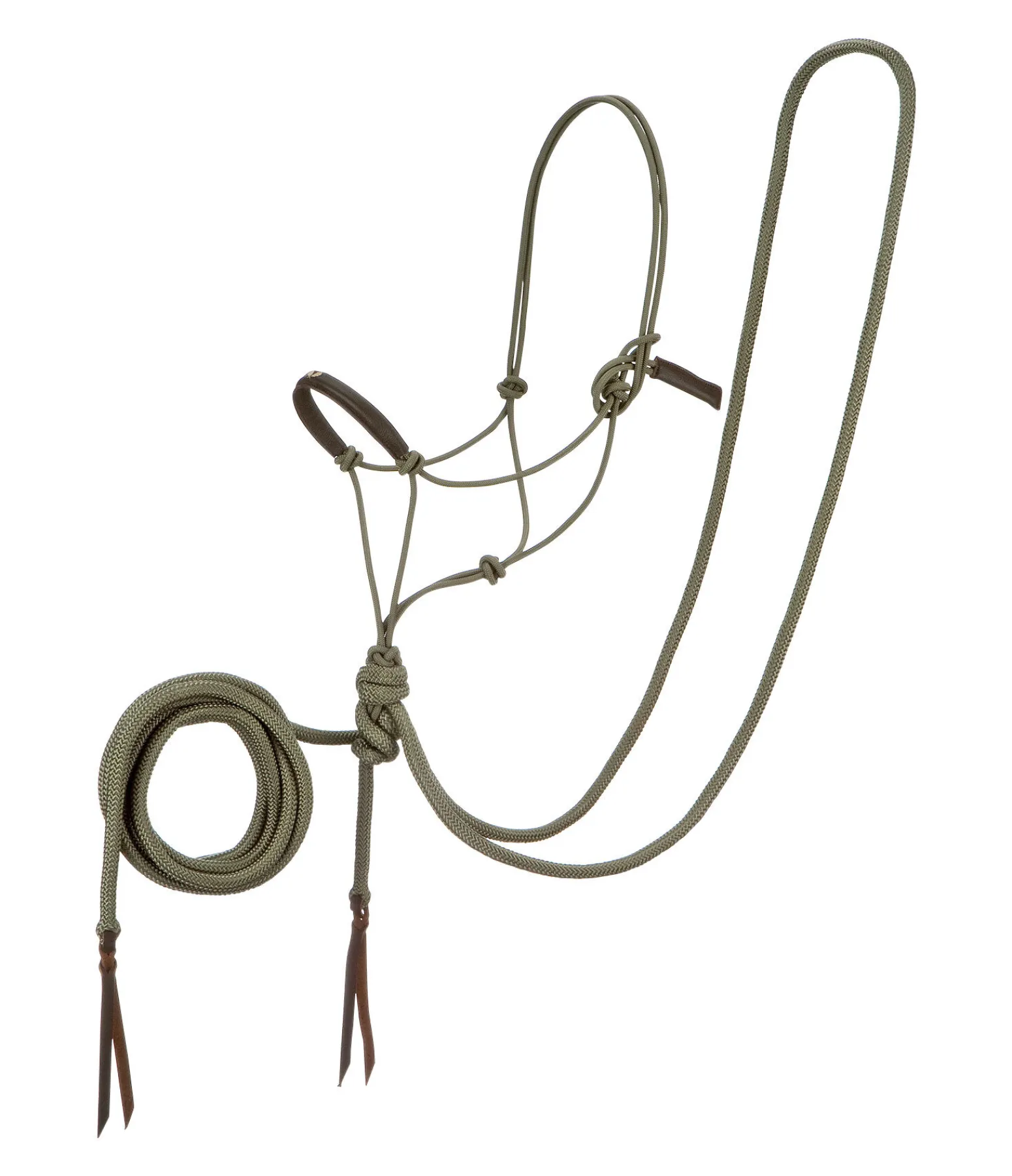 Locil à noeuds avec rênes mecate de 6,7 m de long ( Ø 1,6 cm) ce qui permet d’utiliser le licol également comme licol d’équitation ou de marche. Les extrémités des mecate sont dotées d’un revers en cuir. Rembourrage en cuir souple sur la muserolle avec logo en relief. Le noud du mécate peut être défait à la main, ce qui permet d’utiliser le licol comme licol à nouds normal. Le diamètre du licol est d’environ 0,7 cm: Licol 100 % de polypropylène.