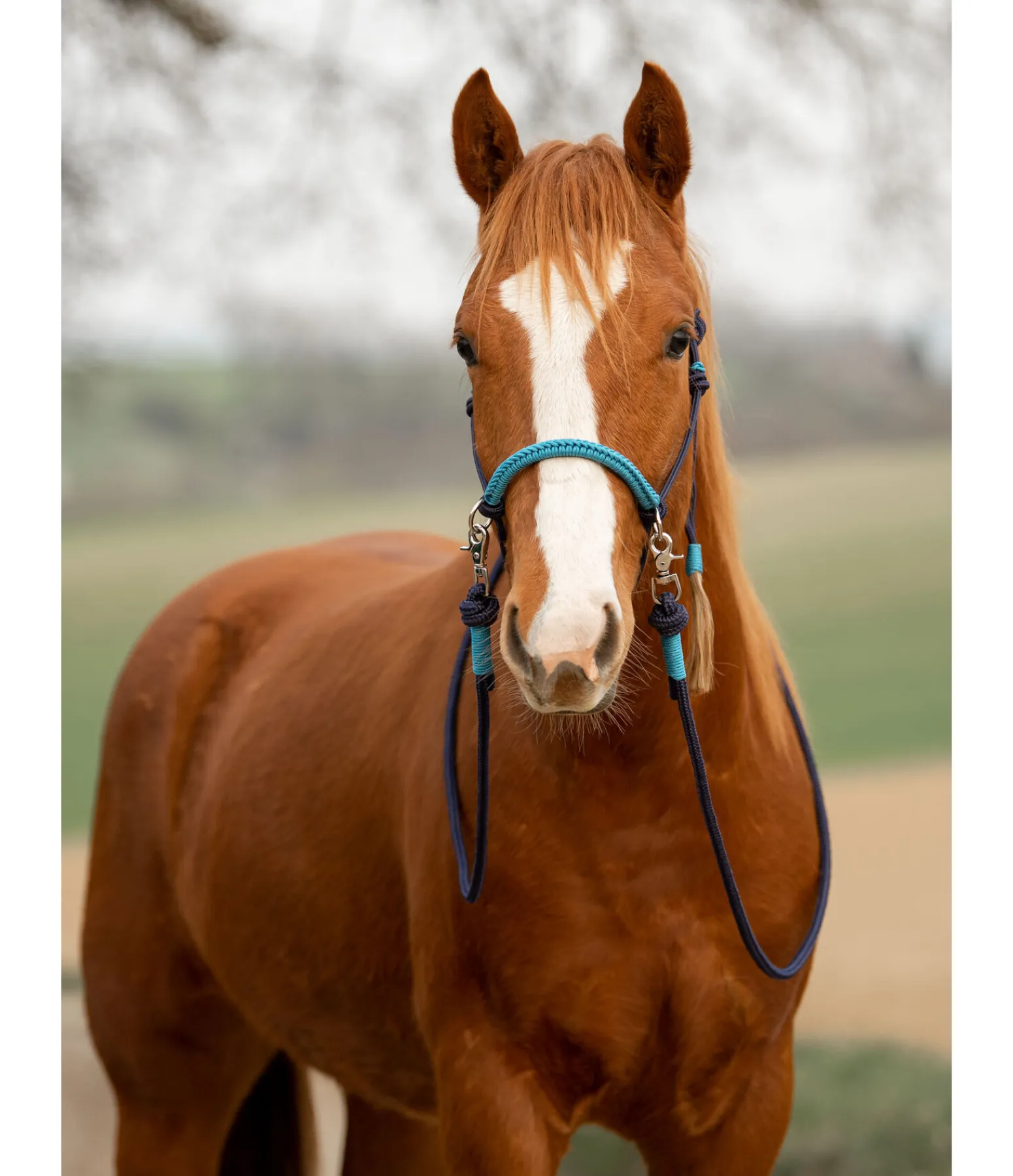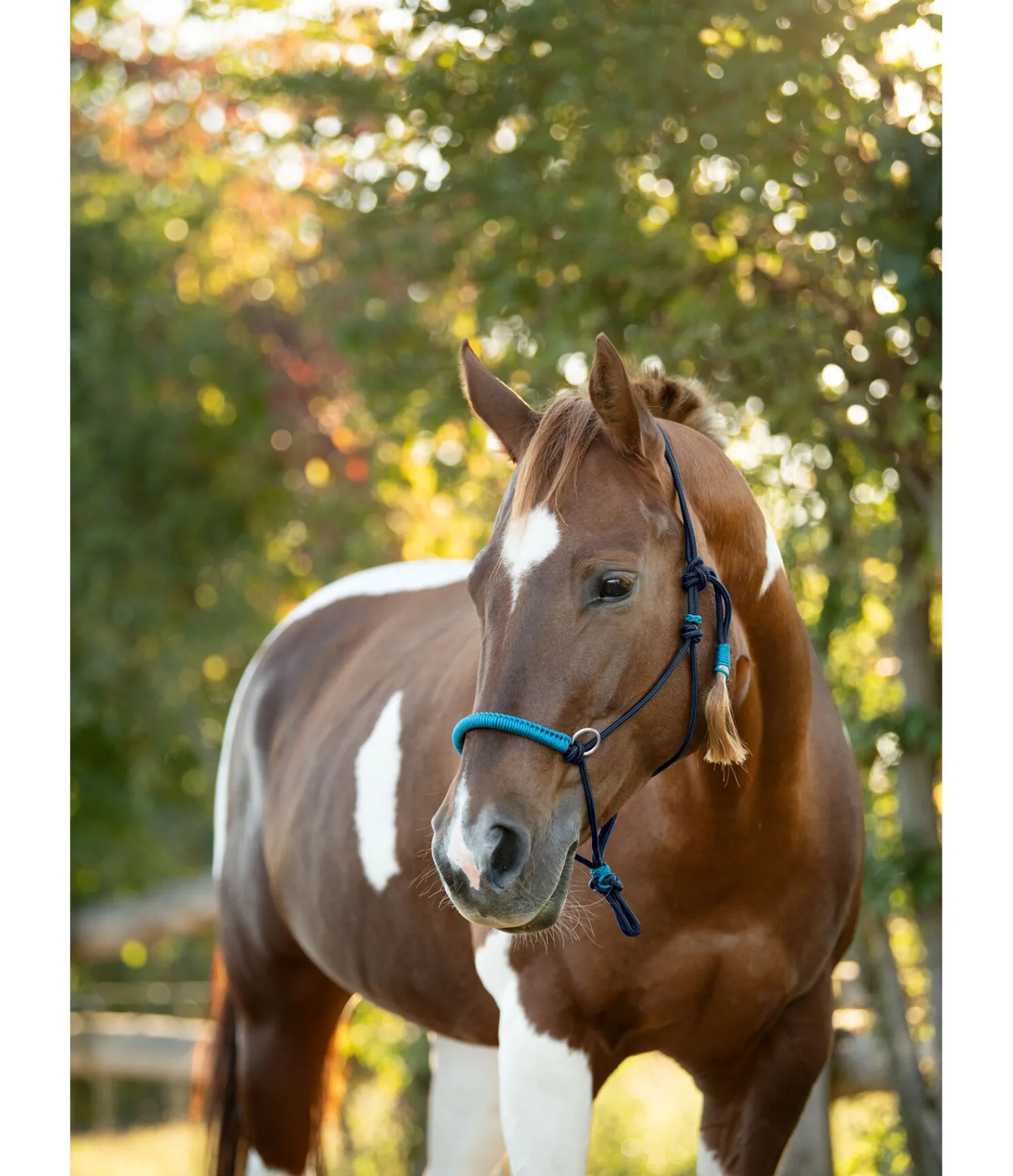 Magnifique licol à noeuds avec muserolle réglable. Idéal pour une communication précise avec le cheval. Muserolle renforcée et anneaux pour rênes. Épaisseur de la corde 6 mm. Avec pompon. 100 % polypropylène.