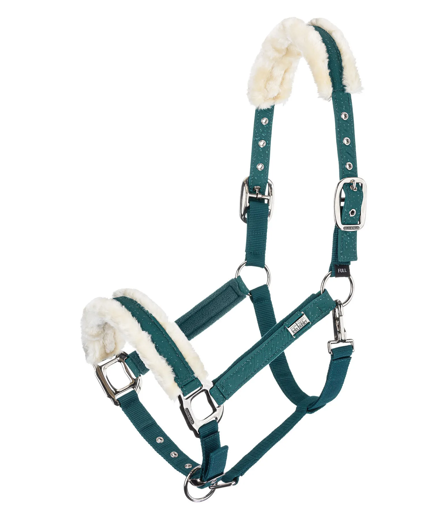 Magnifique licol avec revêtement satiné orné de fragments scintillants et bouclerie de couleur assortie. Têtière et muserolle avec doublure douce en polaire Teddy. Petite plaque élégante avec logo gravé sur chaque montant. Têtière doublement réglable et muserolle réglable. Licol 100 % polypropylène, doublure et revêtement 100 % polyester.