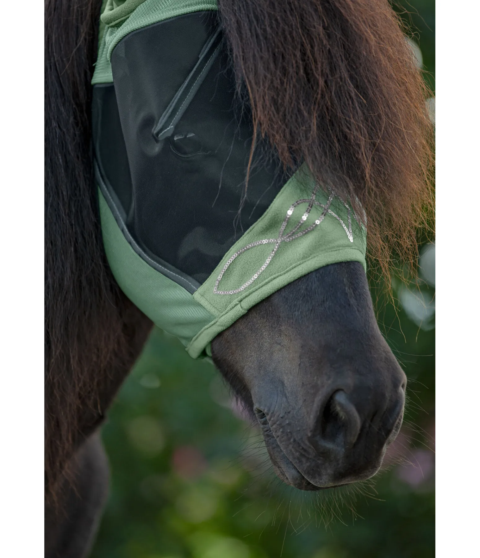 Masque anti-mouches chic et fonctionnel orné d’une broderie à sequins. Éloigne les mouches des yeux du cheval en ajoutant une touche glamour.