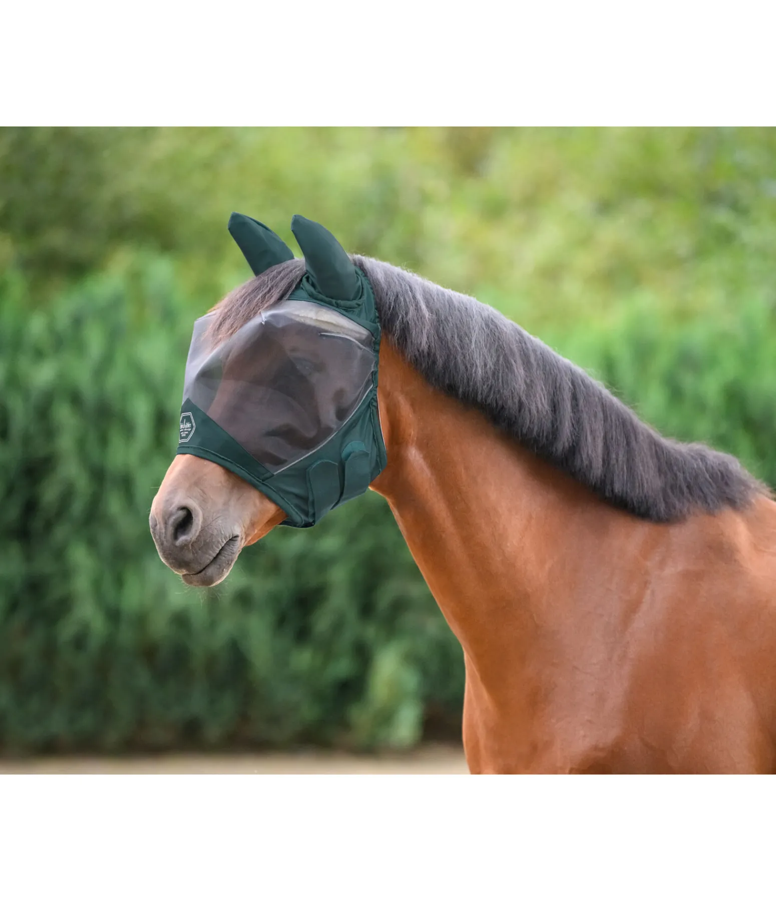 Masque anti-mouches et anti-salissures. Idéal pour les chevaux sensibles. Filet à maille serrée avec coutures renforcées. Bloque au moins 50 % des rayons UV tout en offrant une bonne visibilité. Filet conçu dans une matière extensible absorbant l’humidité pour protéger les oreilles. Efficace contre les moustiques et autres insectes. Doublure en polaire Teddy douce au niveau du front pour un confort optimal et bordure en polaire autour du chanfrein pour éviter les irritations dues aux frottements, élastiqué autour de l’encolure pour un ajustement parfait. Avec passage de toupet et double patte auto-agrippante pour un maintien sûr. 100 % polyester.