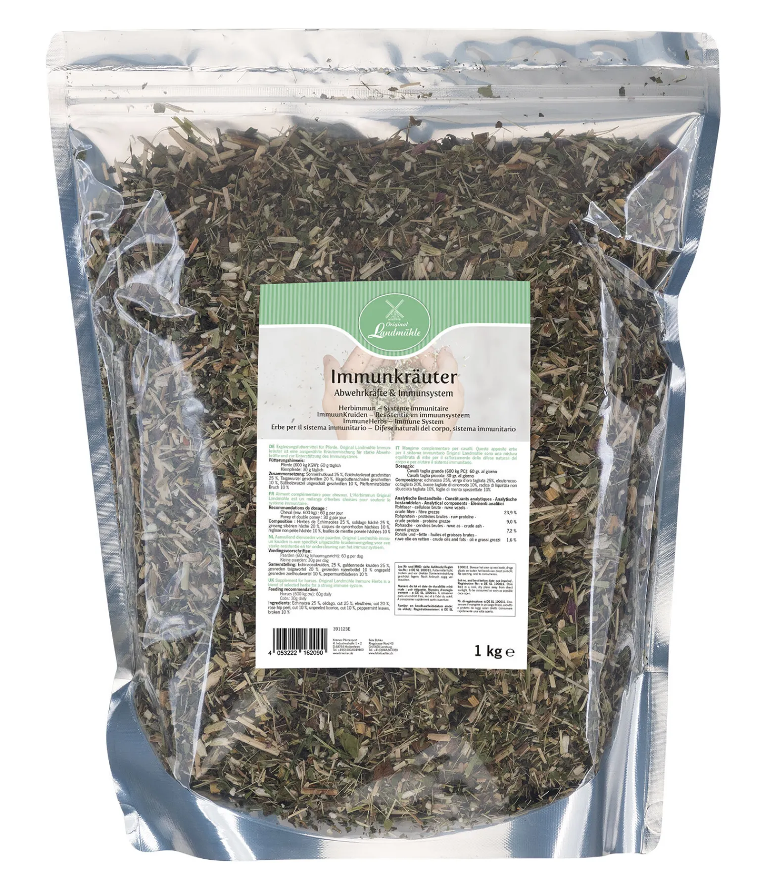 Composition : Echinacées 25 %, solidago hâché 25 %, ginseng sibérien hâché 20 %, coques de cynorrhodon hâchées 10 %, réglisse hâchée 10 %, feuilles de menthe poivrée hâchées 10 %.