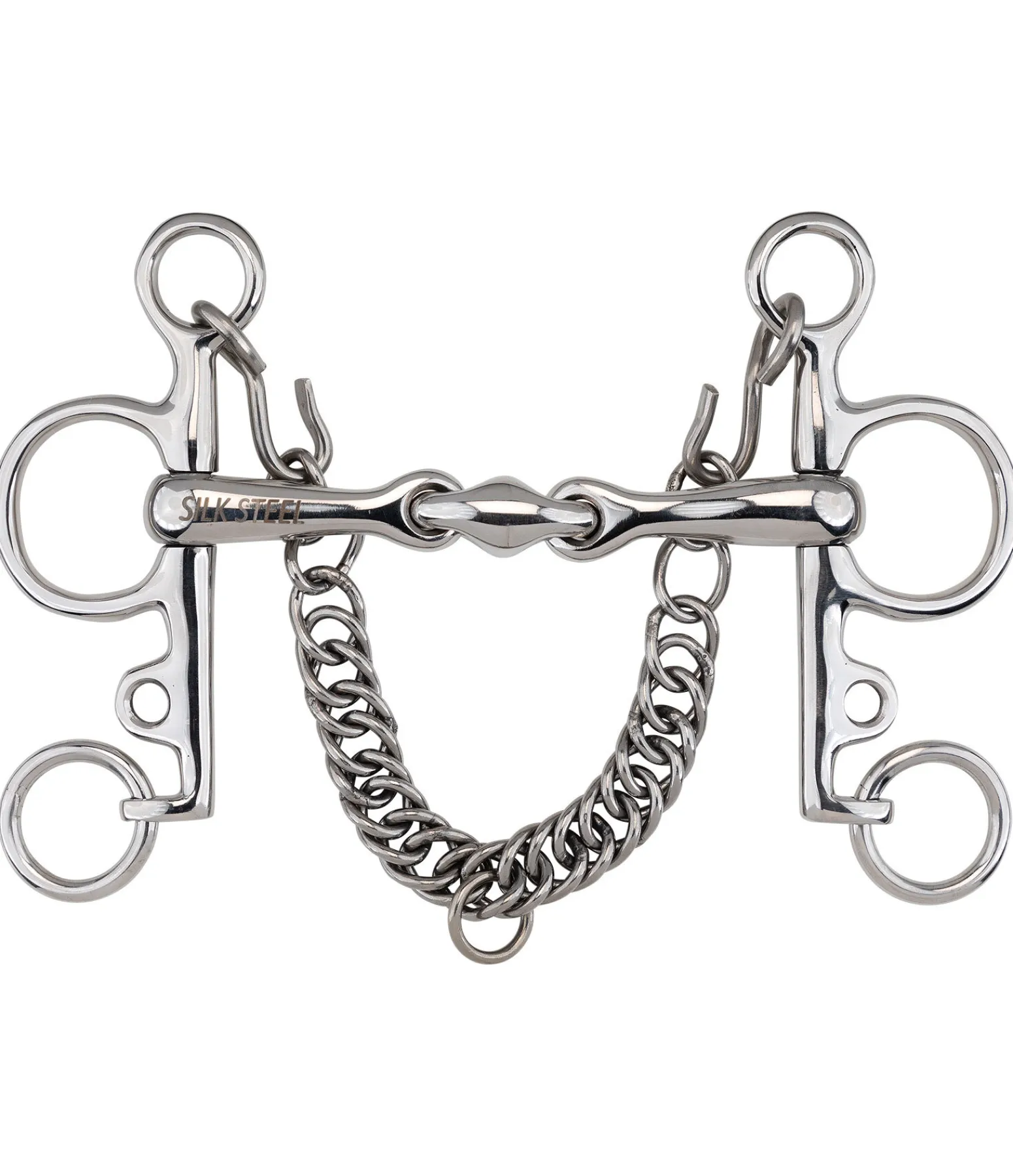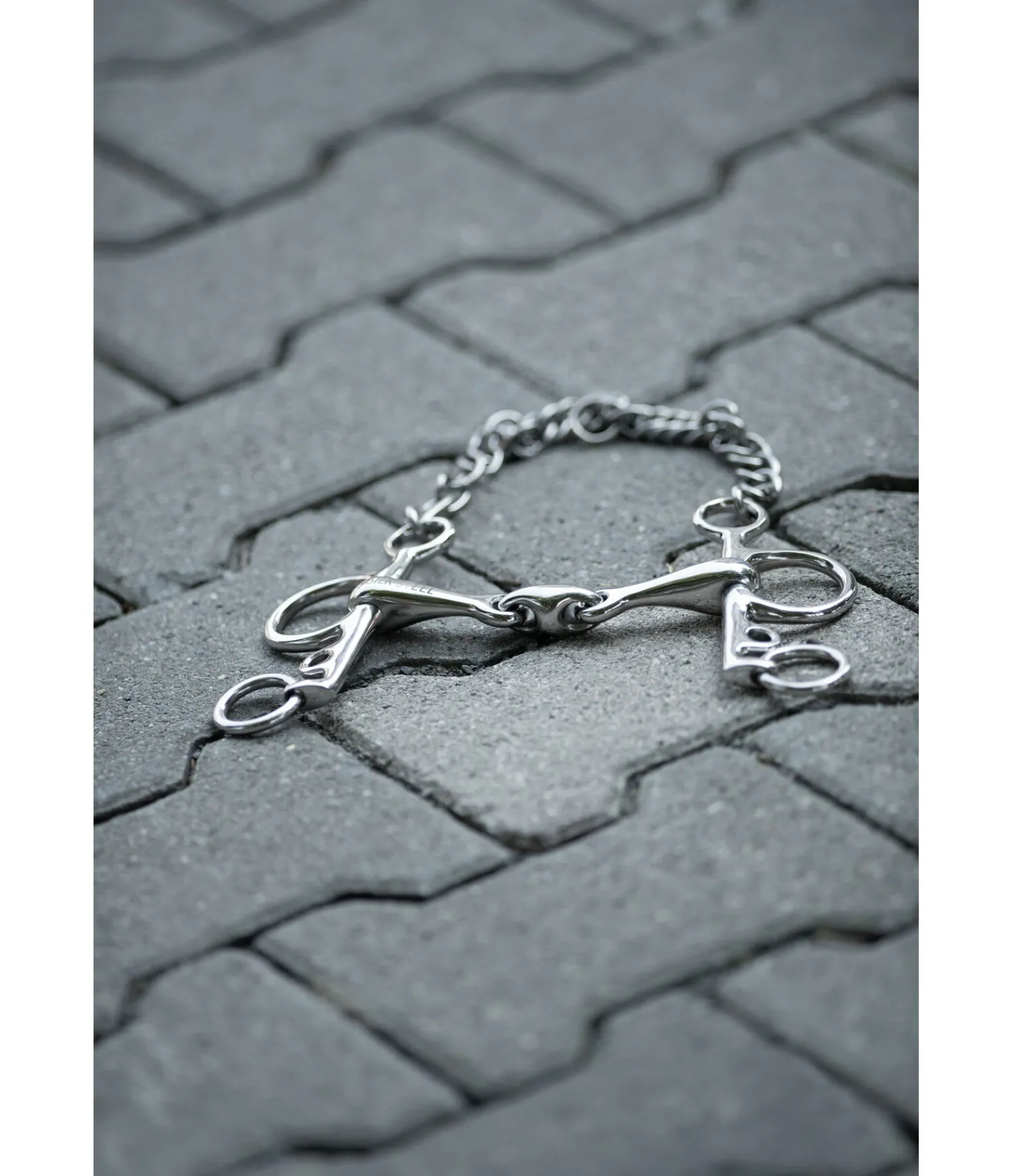 Mors pelham en acier inoxydable. Double brisure. Épaisseur des canons : 14 mm. Longueur des branches : 5,6 cm en bas et 5,4 cm en haut.