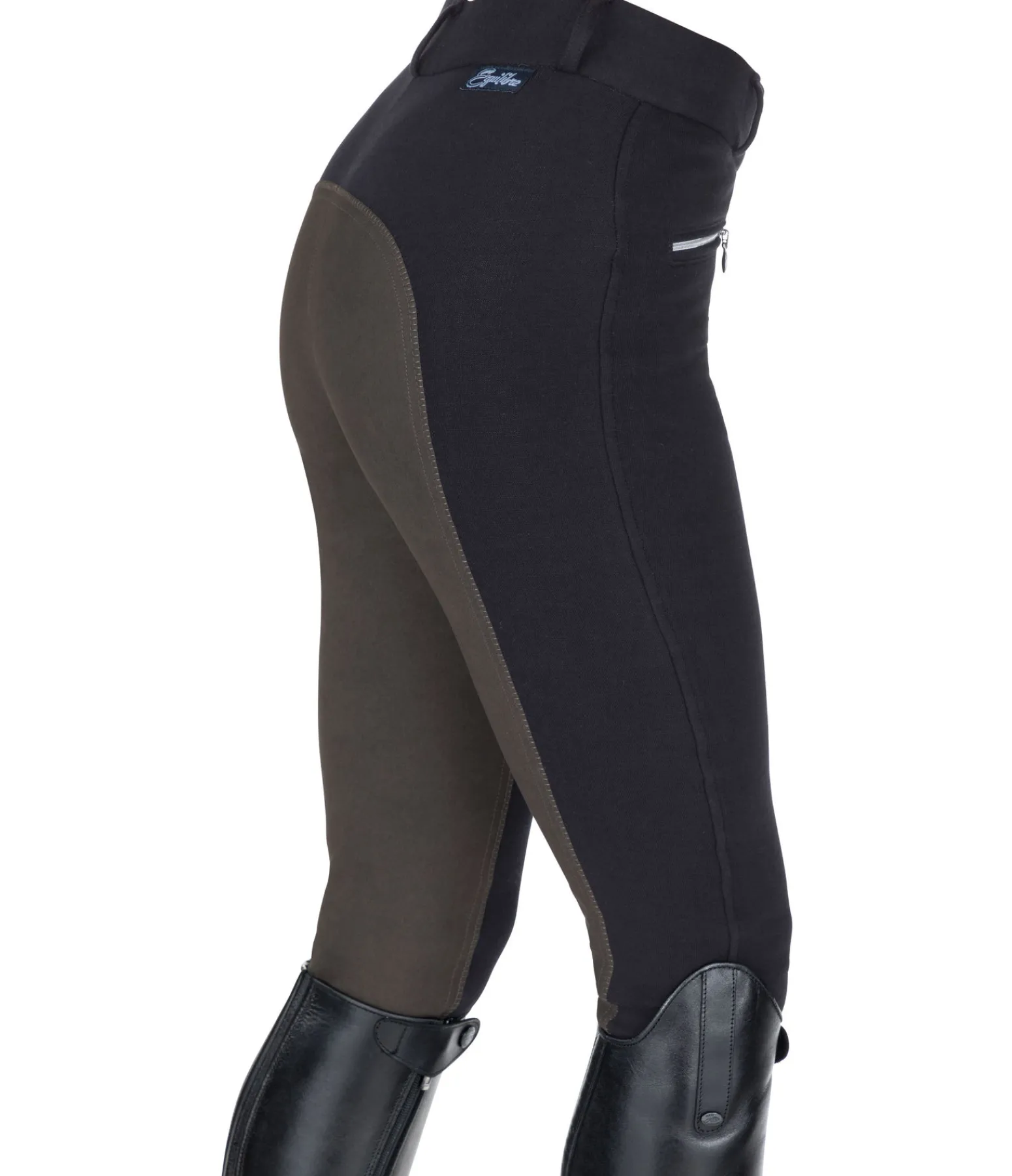 Pantalon d’équitation basique avec fond intégral en synthétique. Matière très extensible et extrêmement douce. 1 poche zippée avant. Large ceinture élastiquée avec 2 boutons. Bas de jambe extensible, sans patte auto-agrippante. 95 % coton, 5 % élasthanne.