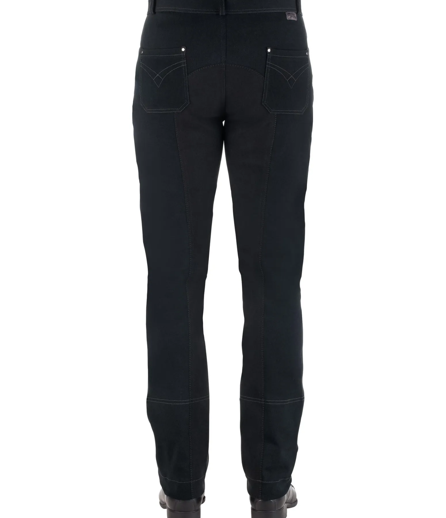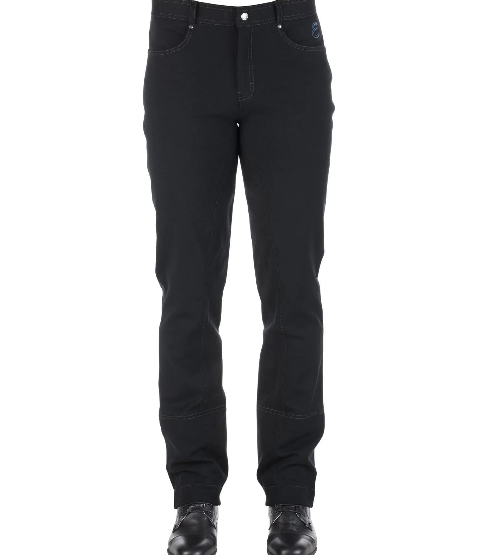 Pantalon d’équitation. Fond intégral jusqu’au bas des jambes. Aspect jean. Coupe Bootcut. Sous-pieds élastiqués réglables. 2 poches avant. 2 poches arrière. 95 % coton, 5 % élasthanne.