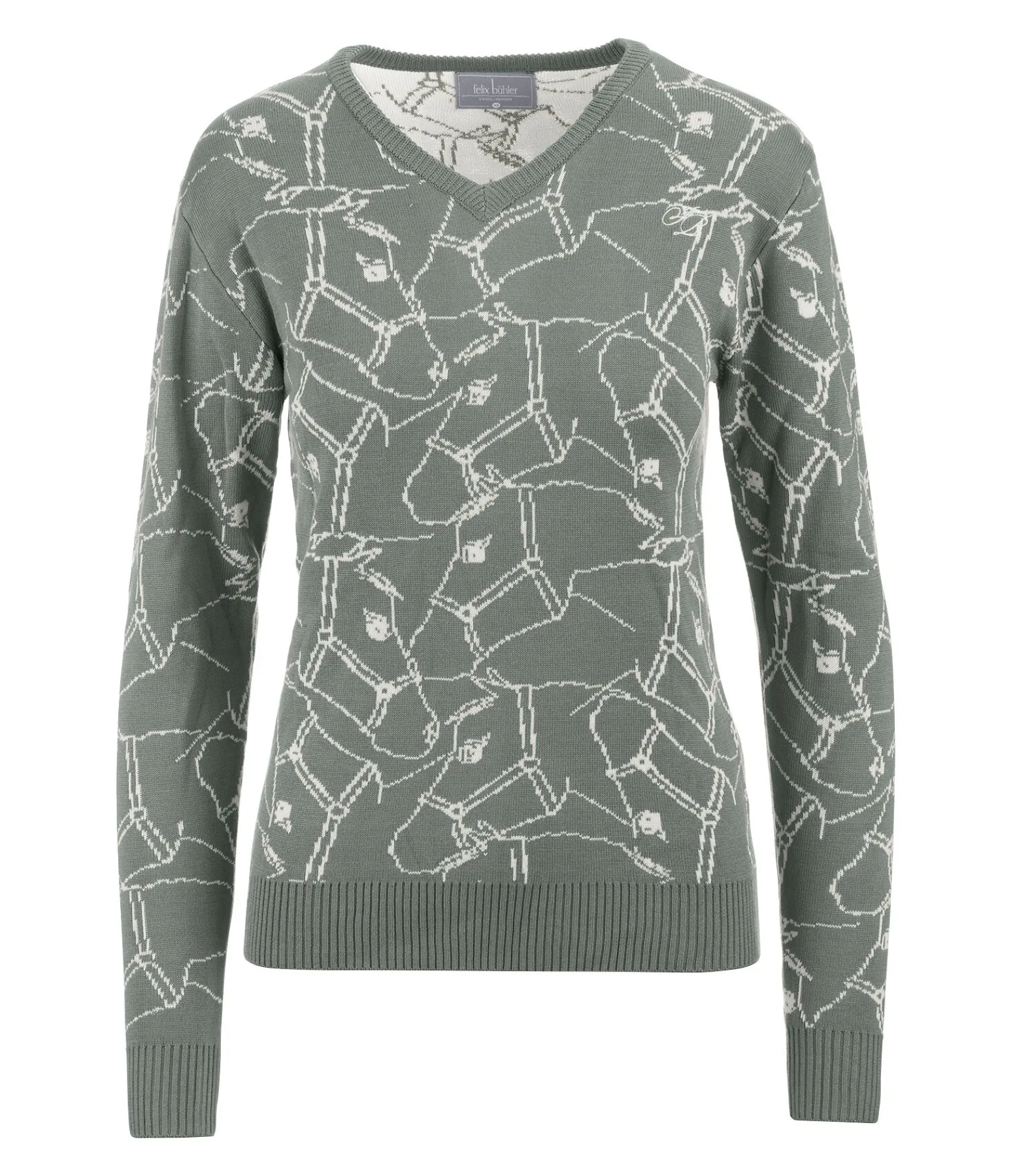 Pull col V doux, tissé en jacquard avec imprimé cheval. Logo brodé sur la poitrine. Finition en bord-côte sur le col, le bas des manches et l’ourlet. 55 % viscose, 45 % polyacrylique.
