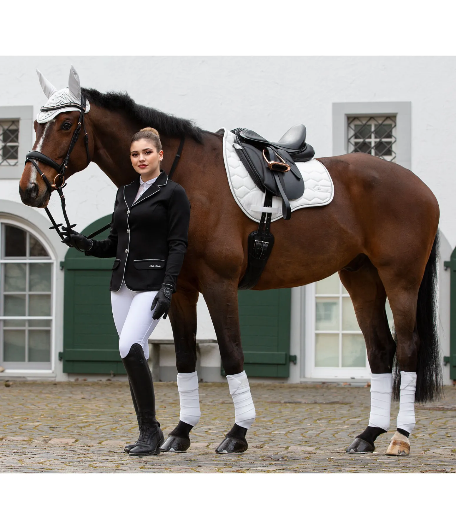 Tapis de selle dans une coupe sportswear avec protection contre les frottements de couleur contrastante à l’aspect velours au passage de sangle. Petite plaque argentée filigrane avec logo gravé de chaque côté et cordon décoratif discret satiné de couleur contrastante. Passants de sangle et de contre-sanglons avec patte auto-agrippante pratique. Dessous en Air mesh respirant et absorbant l’humidité. Dessus 100 % coton, rembourrage et dessous 100 % polyester.