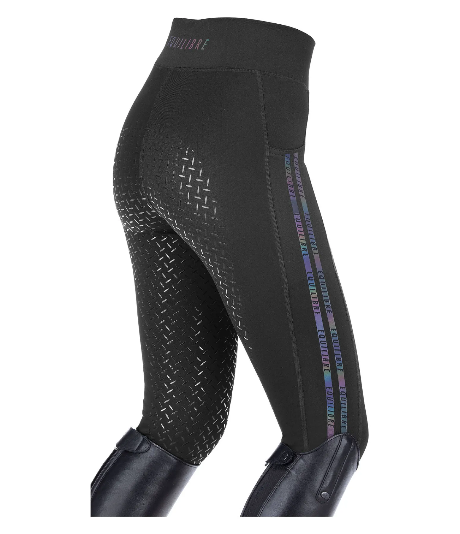 Legging d’équitation enfant sportswear. Matière respirante douce et extensible dans 4 directions. Fond intégral en silicone. 2 poches latérales pour téléphone portable. Bandes floquées avec reflets multicolores sur le côté. Logo marque avec reflts multicolores devant et à la ceinture arrière. 86 % polyester, 14 % élasthanne.