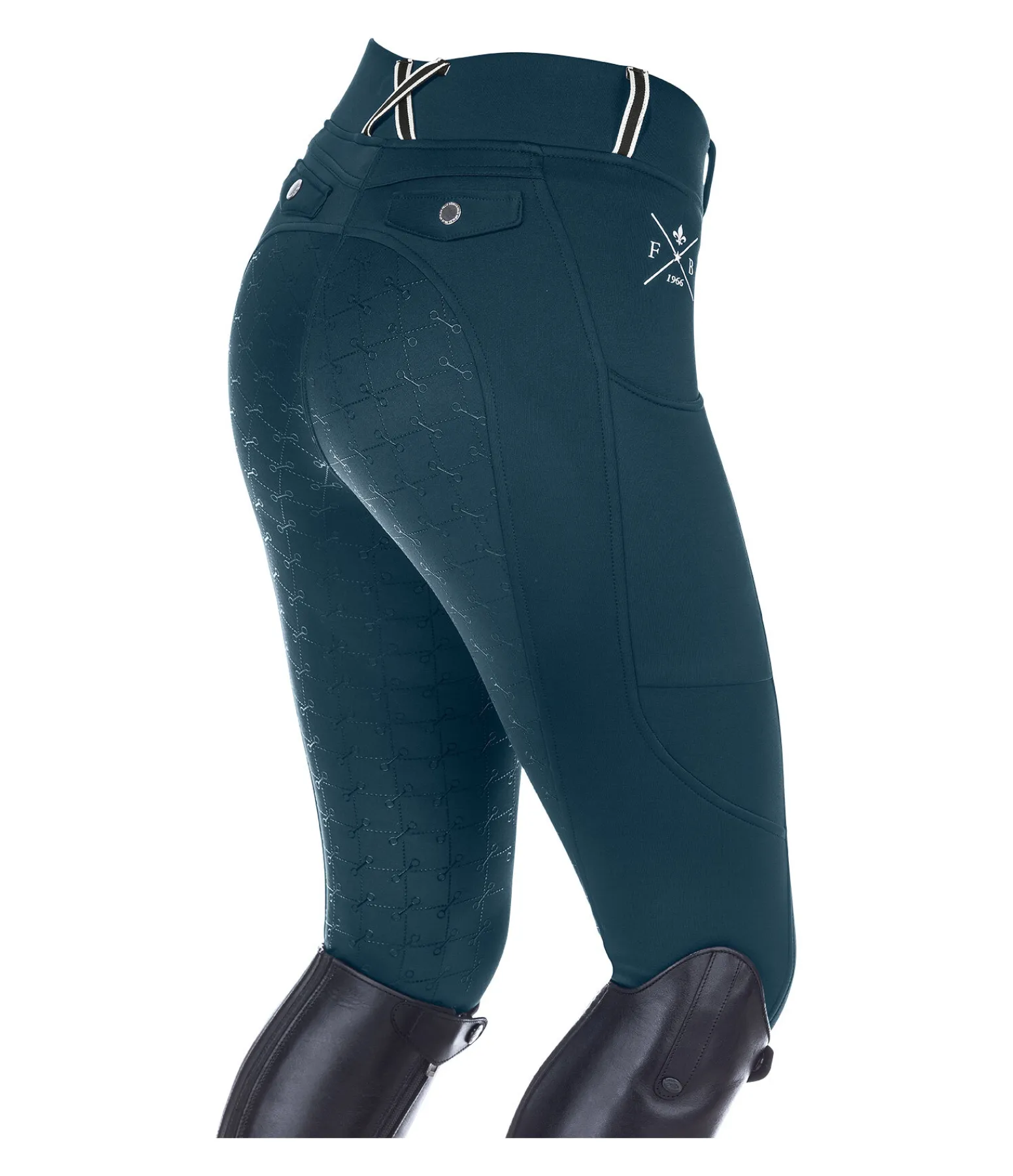 Legging d’équitation sportswear thermique avec fond intégral grip en silicone. Matière stretch respirante, extensible dans 4 directions. Séchage rapide. Intérieur molletonné. Imprimés Felix Bühler. Ceinture large avec passants. Une poche latérale zippée pour téléphone portable et deux fausses poches arrière. Aucune couture au niveau des genoux. Bas de jambe extensible. 60 % polyester, 33 % polyamide, 7% élasthanne.