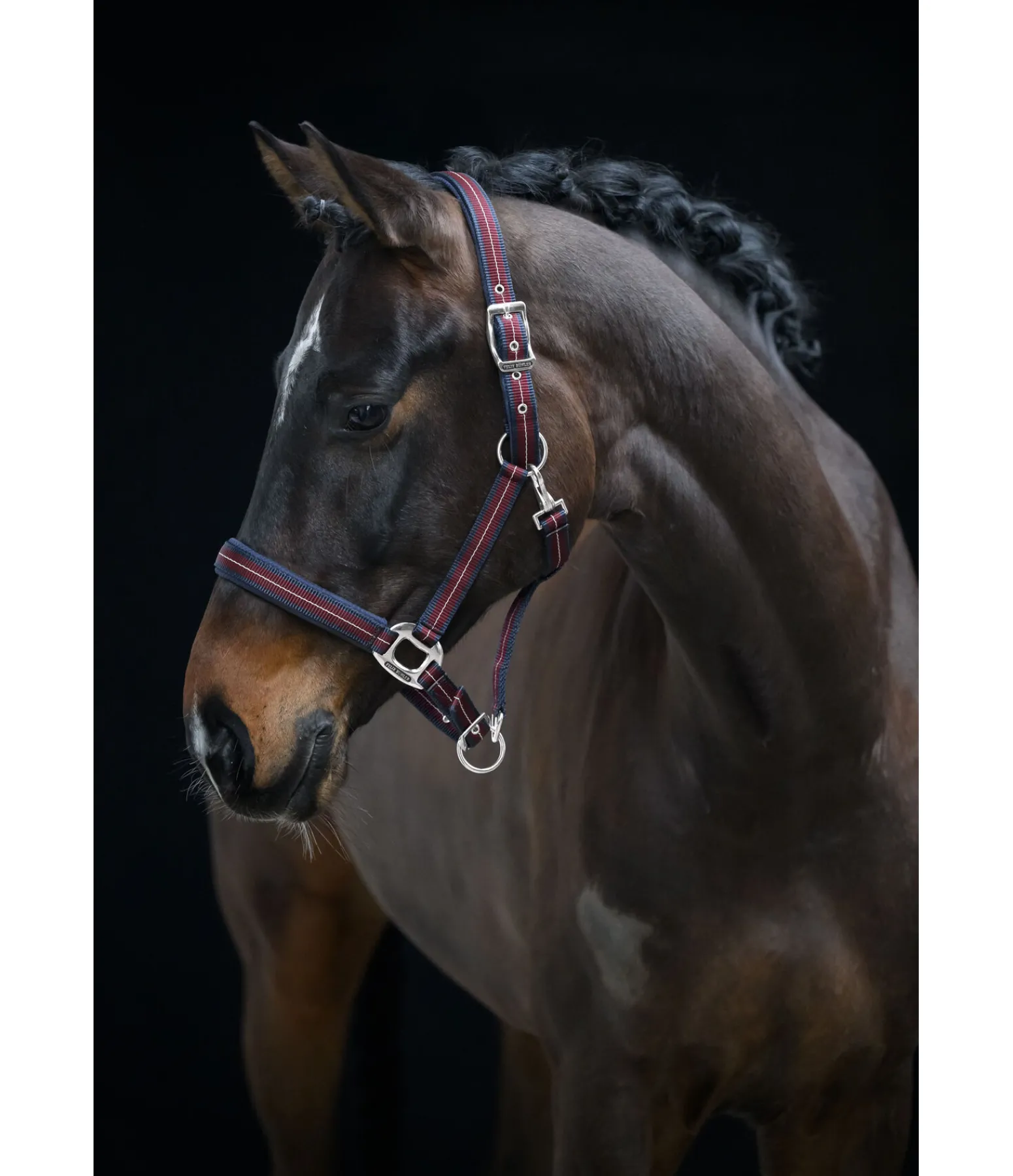Licol rayé dans un look sportif avec doublure respirante en mesh sur la têtière et la muserolle. Muserolle et têtière réglables. Licol 100 % polypropylène.