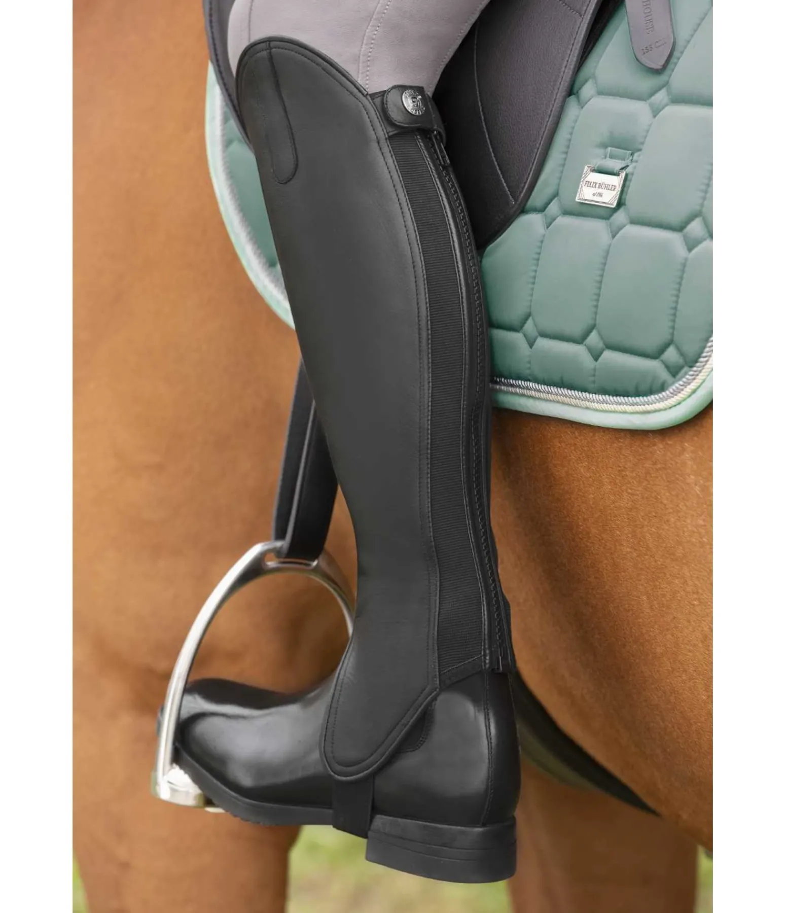 Mini-chaps souples en cuir de vachette antidérapant pour une adhérence optimale entre la jambe et le quartier de la selle, dans un design évoquant des bottes cavalières. Fermeture à glissière YKK solide à l’arrière avec bouton-pression et empiècements élastiques des deux côtés pour un ajustement parfait.