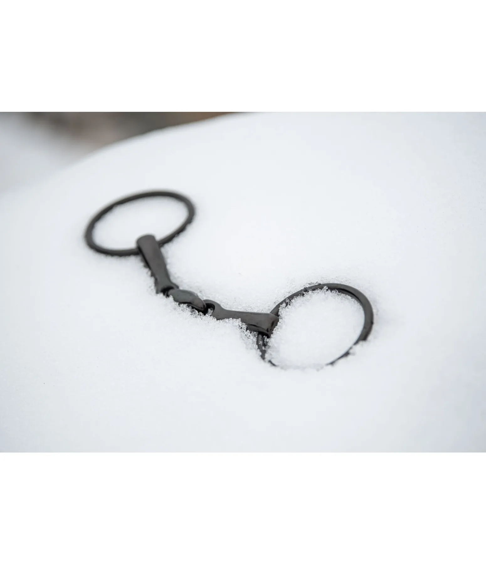 Mors double brisure. Forme anatomique. Anneaux mobiles. Couleur noire. Revêtement par poudre composé d’une combinaison de titane et d’aluminium. Non toxique pour les chevaux. Le revêtement présente une petite lacune au niveau des anneaux du mors. Il ne s’agit pas d’un défaut de qualité, mais uniquement du processus de fabrication. Infos sur les matériaux & caractéristiques :