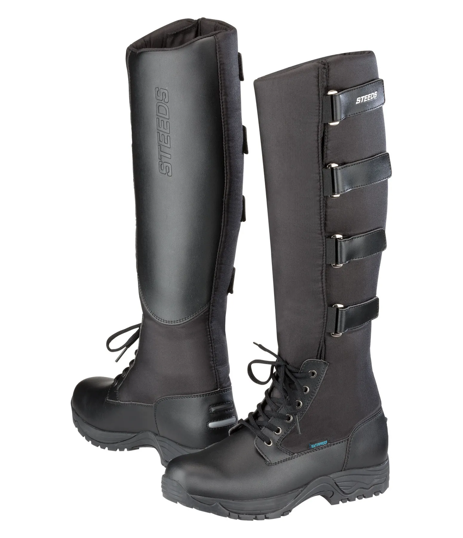 Bottes thermiques et imperméables. Doublure intérieure en polaire (100 % polyester). Semelle double Layer pour une assise plantaire optimale avec semelle intermédiaire pour absorber les chocs et semelle extérieure résistante à l’usure. Revêtement imperméable pour éviter que l’eau ne s’infiltre. Tige en nylon robuste. PU souple et résistant au niveau du pied. Renforcement sur la face interne du mollet pour un maintien parfait aux quartiers de la selle. Laçage à l’avant et quatre pattes auto-agrippantes sur la tige pour un confort optimal. Trois tailles de tige disponibles. Taquet d’éperon et bande réfléchissante à l’arrière.