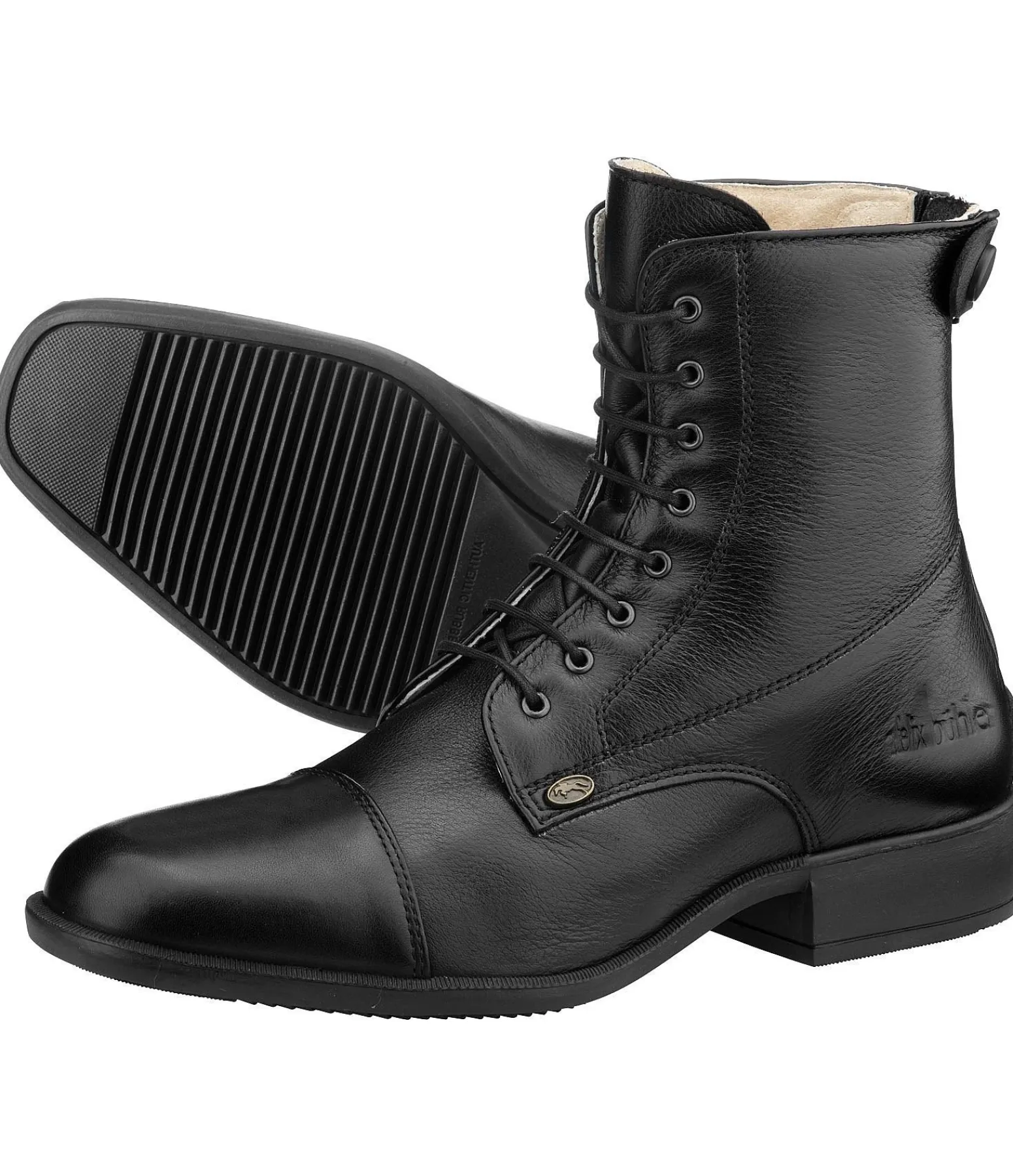 Élégantes bottines à lacets en cuir de vachette italien pleine fleur. Fermeture à glissière à l’arrière pour faciliter l’enfilage et retrait. Doublure intérieure souple en cuir de porc. Bout légèrement carré. Semelle extérieure résistante à l’abrasion. Assise plantaire amortissante. Semelle intérieure amovible. Fabriquées au Portugal.