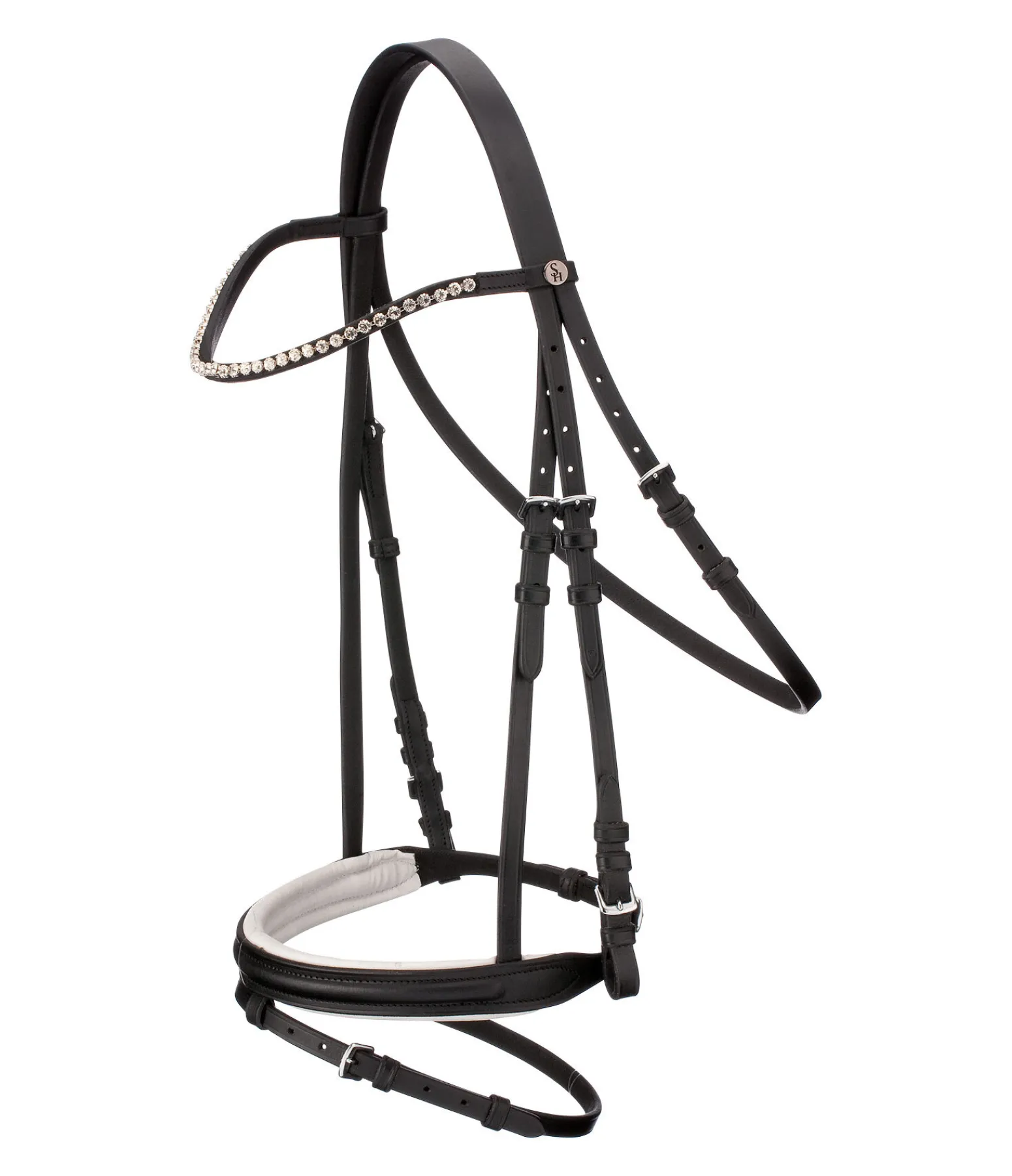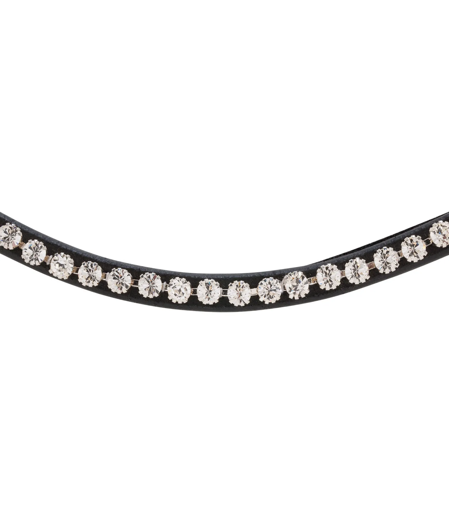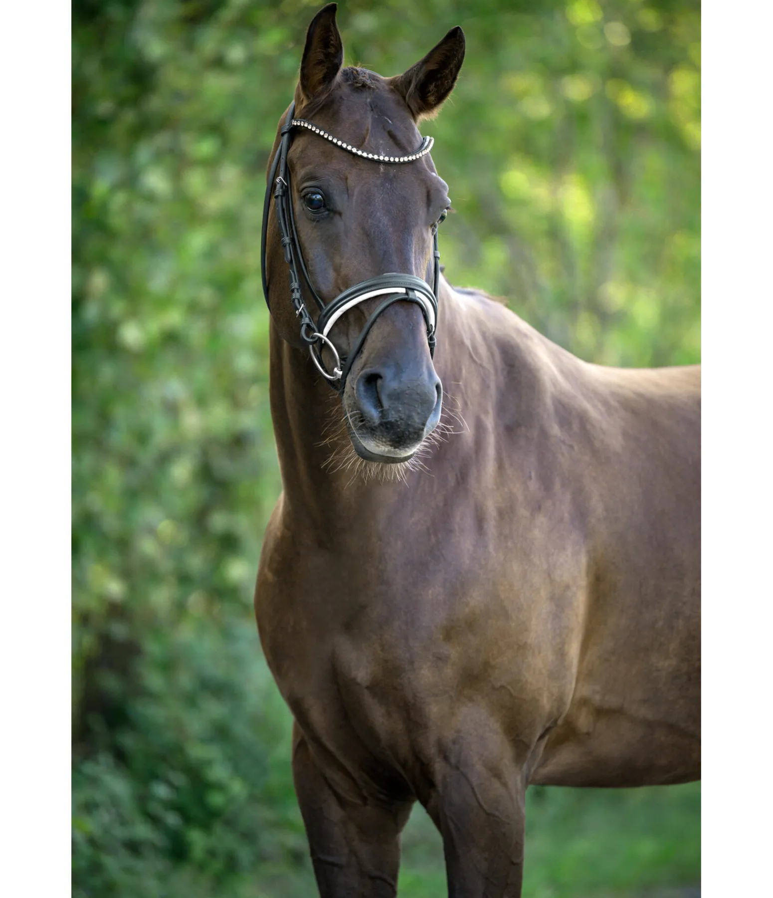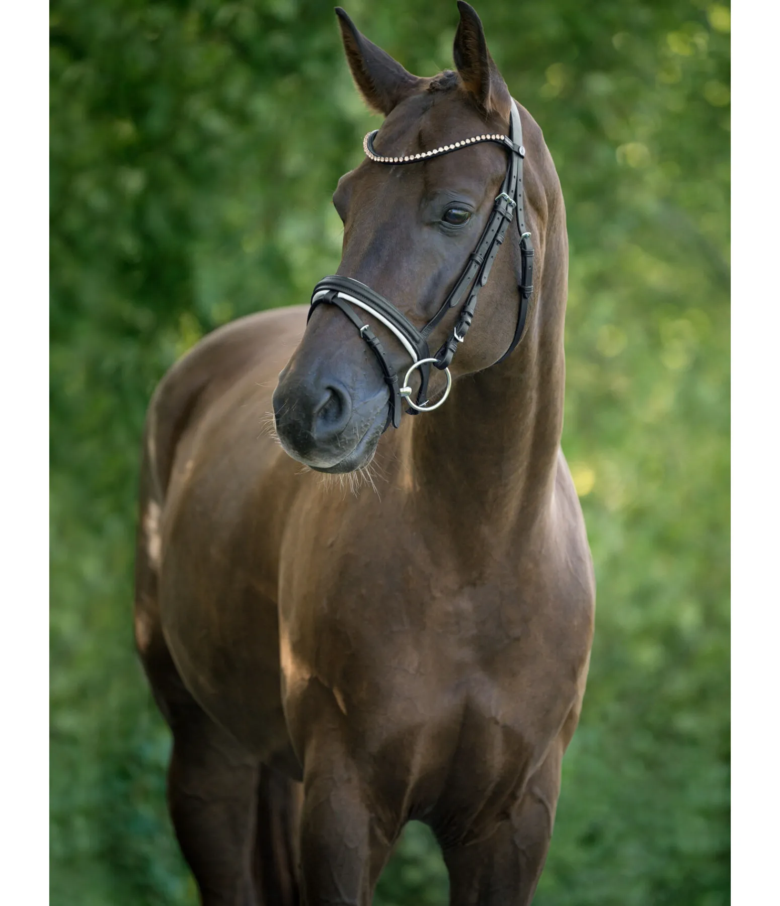 Bridon avec muserolle française combinée et frontal vague avec strass. La doublure douce de la muserolle offre un confort optimal. En cuir véritable. Bouclerie argentée. Sans rênes et sans mors.