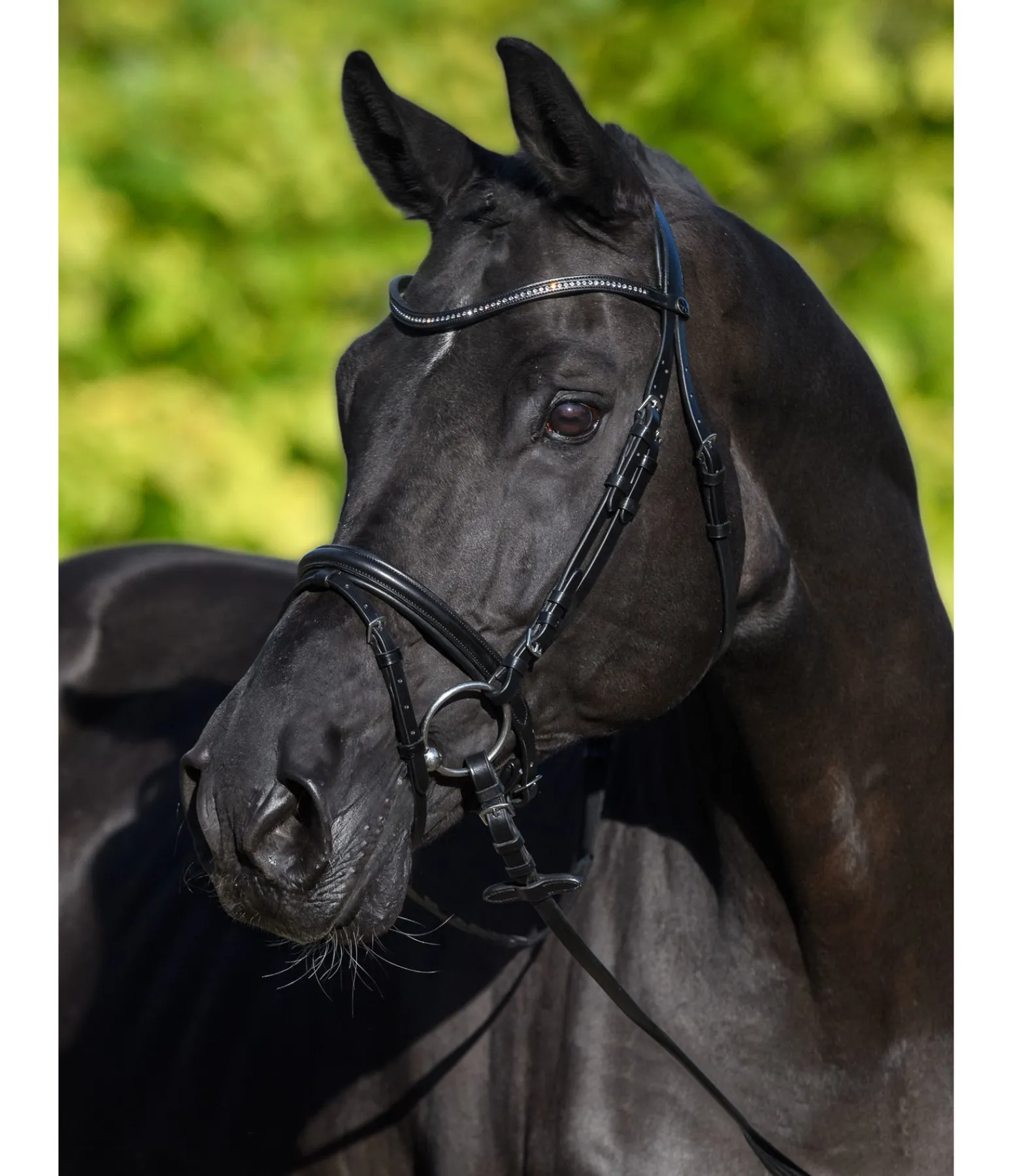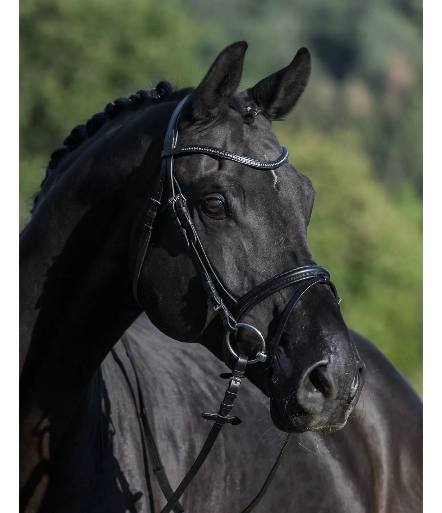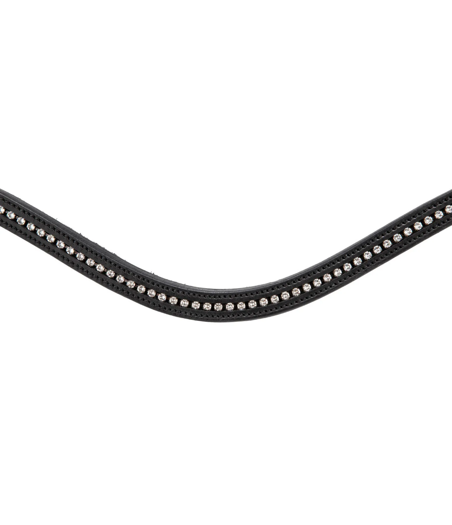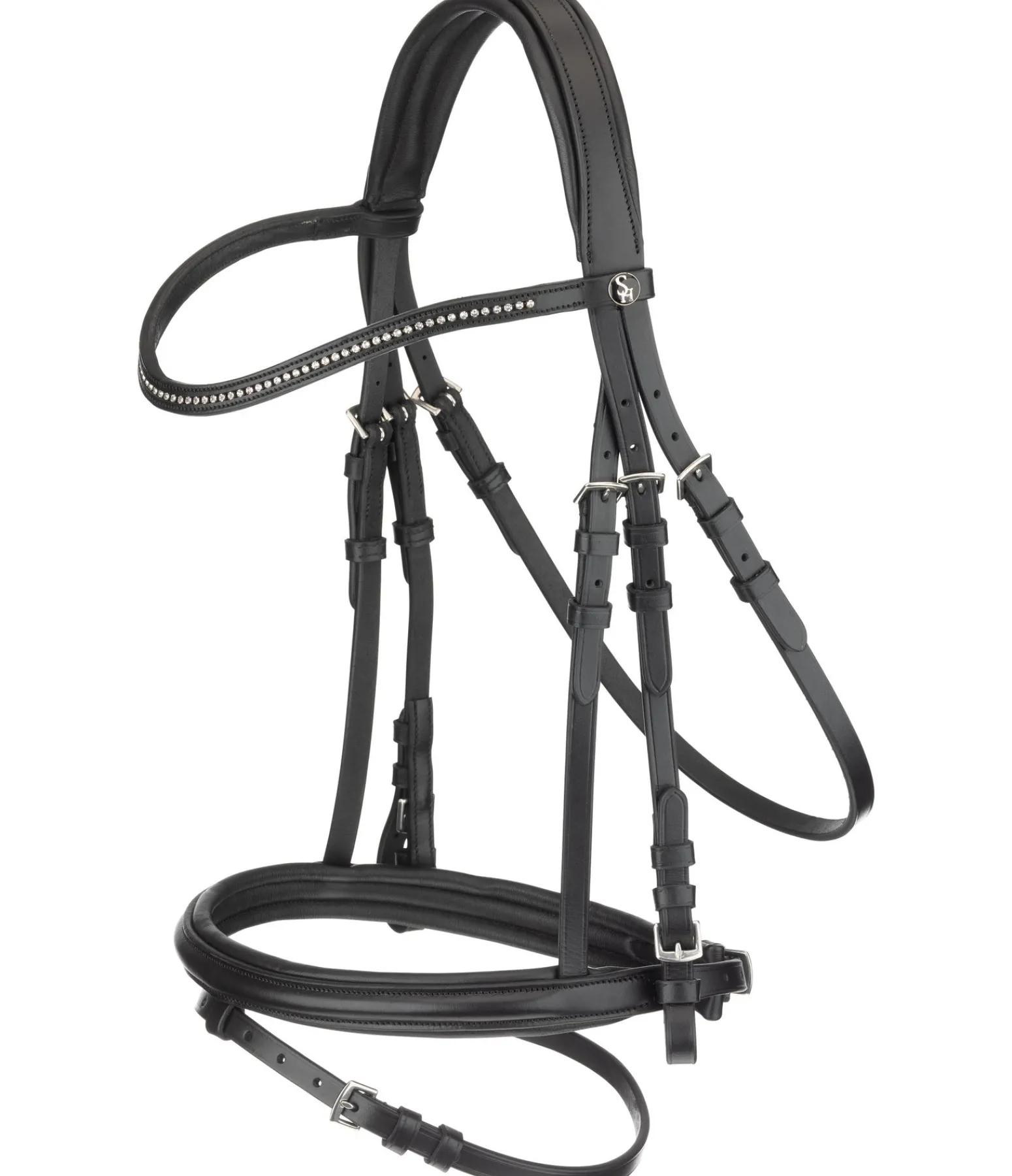 Bridon avec muserolle française combinée et frontal vague avec petits strass blancs discrets.Têtière et muserolle avec doublure douce pour un confort optimal. Conçu en cuir véritable. Bouclerie argentée. Avec rênes sangle, sans mors.