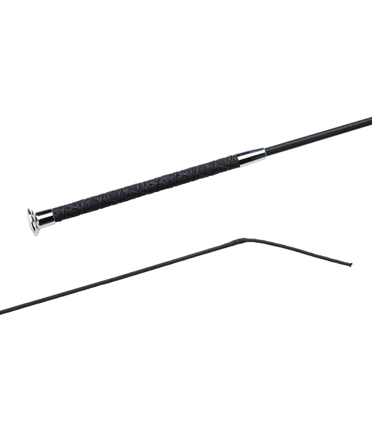 Cravache de dressage avec poignée antidérapante en aspect dentelle. Tige en fibre de verre avec revêtement en nylon.