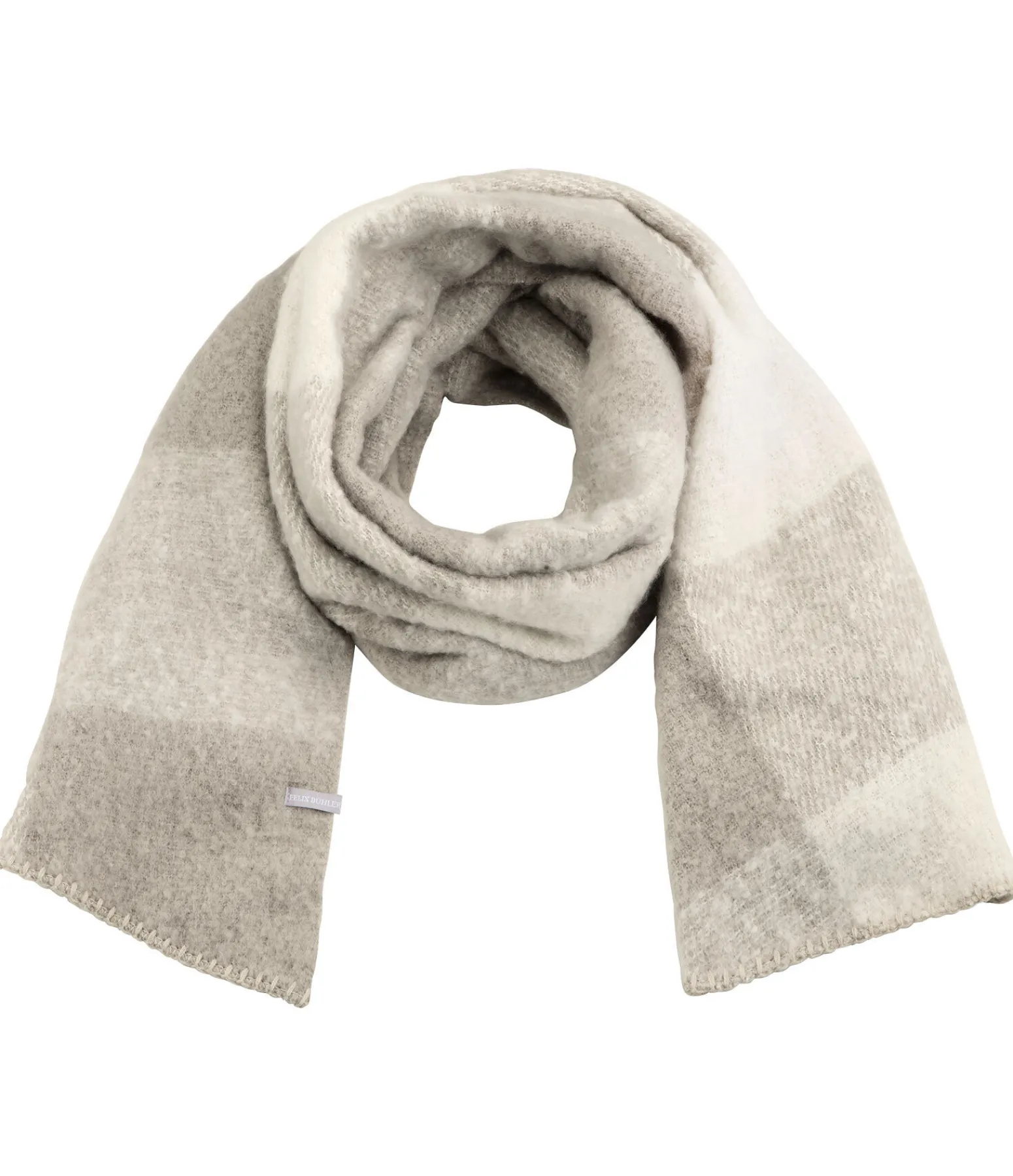 Écharpe asymétrique à grands carreaux bicolores. Environ 190 x 55 cm. 90 % polyester, 10 % laine.