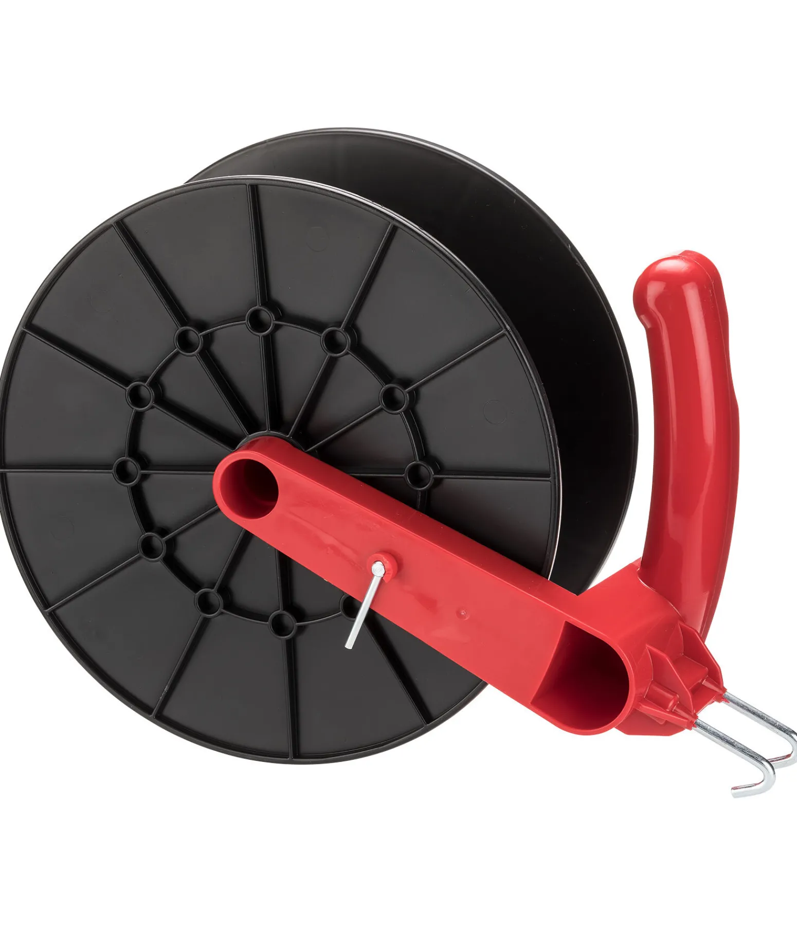 Tambour en plastique. Entièrement isolé. Frein de blocage. Faible poids. Pour max. 200 m de ruban de 40 mm de large. Idéal pour le montage et le démontage des clôtures. Le crochet métallique permet une électrification rapide du conducteur sur l’enrouleur !