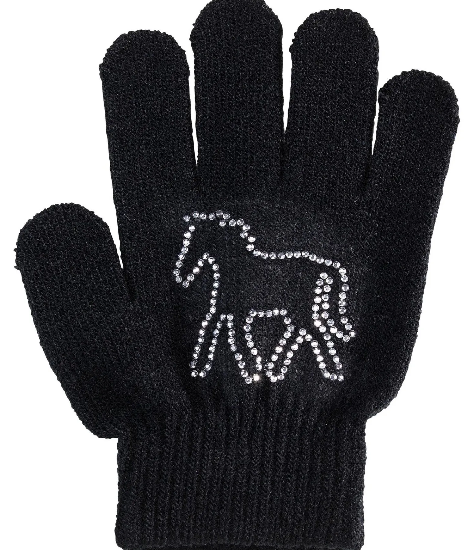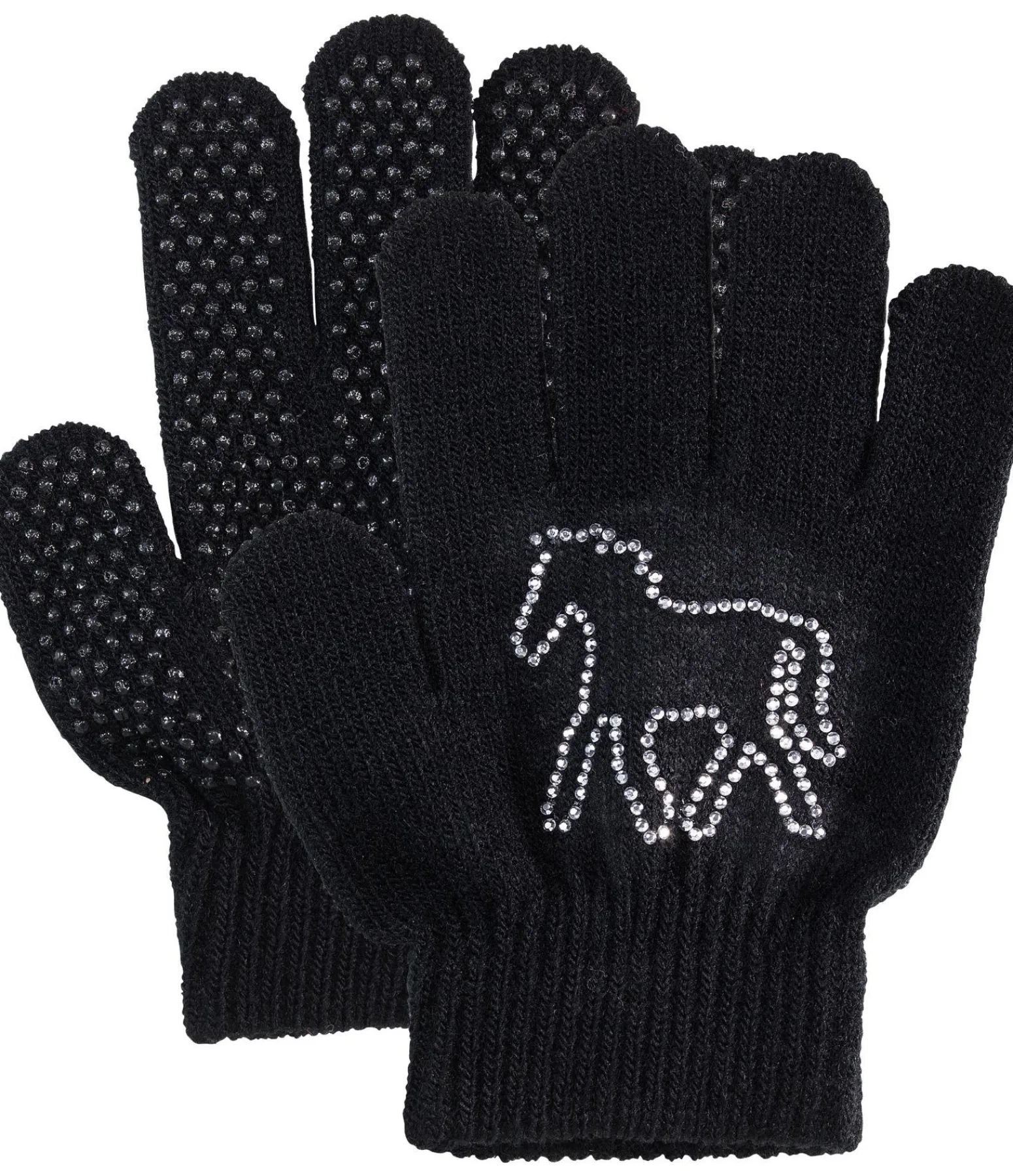 Gants d’équitation agréables et très extensibles ornés d’un cheval en strass. Taille unique, convient à tous les enfants. 50 % polyacrylique, 50 % polyamide.