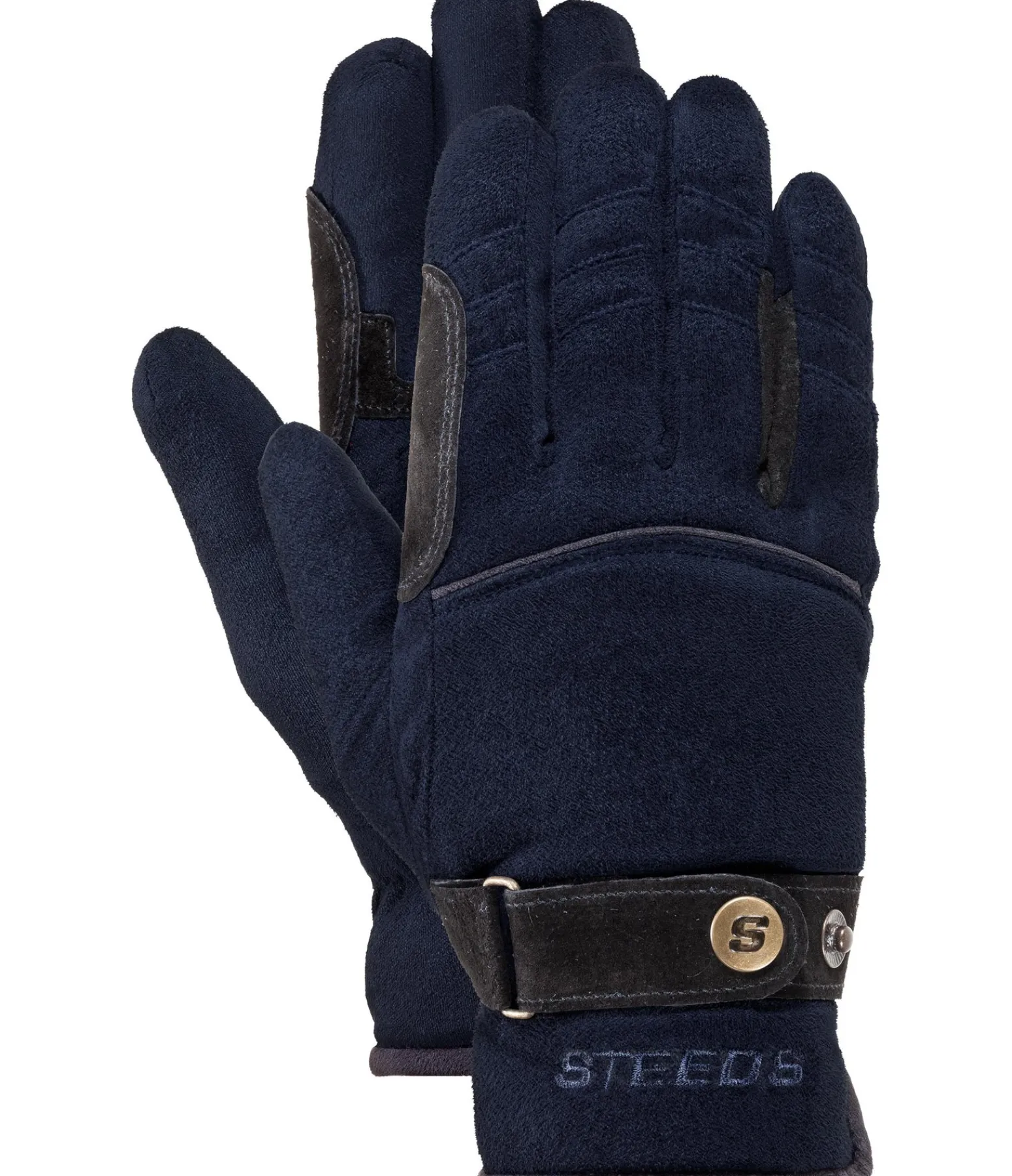Gants chauds et douillets en polaire. Avec renforts intégrés aux passages de rênes et finition bouton-pression au poignet.